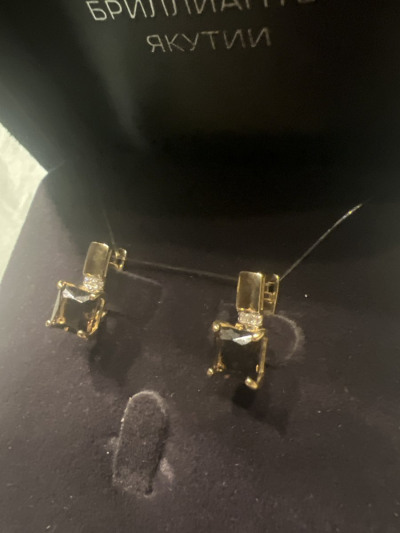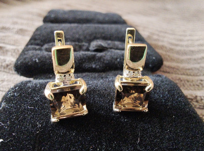 Золотые серьги с бриллиантами природными и кварцами дымчатыми природными