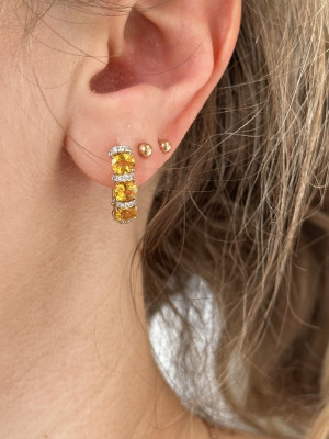 Серьги с 40 бриллиантами, огранка круг 57 граней, 0.337 карат, цвет 3, чистота 6, тип огранки А; 6 сапфирами желтыми, 2.89 карат, тип огранки Б; Желтое золото 585 пробы.