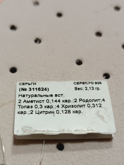 - Аметист природный, Топаз природный, Хризолит природный, Цитрин природный, Родолит синтетический