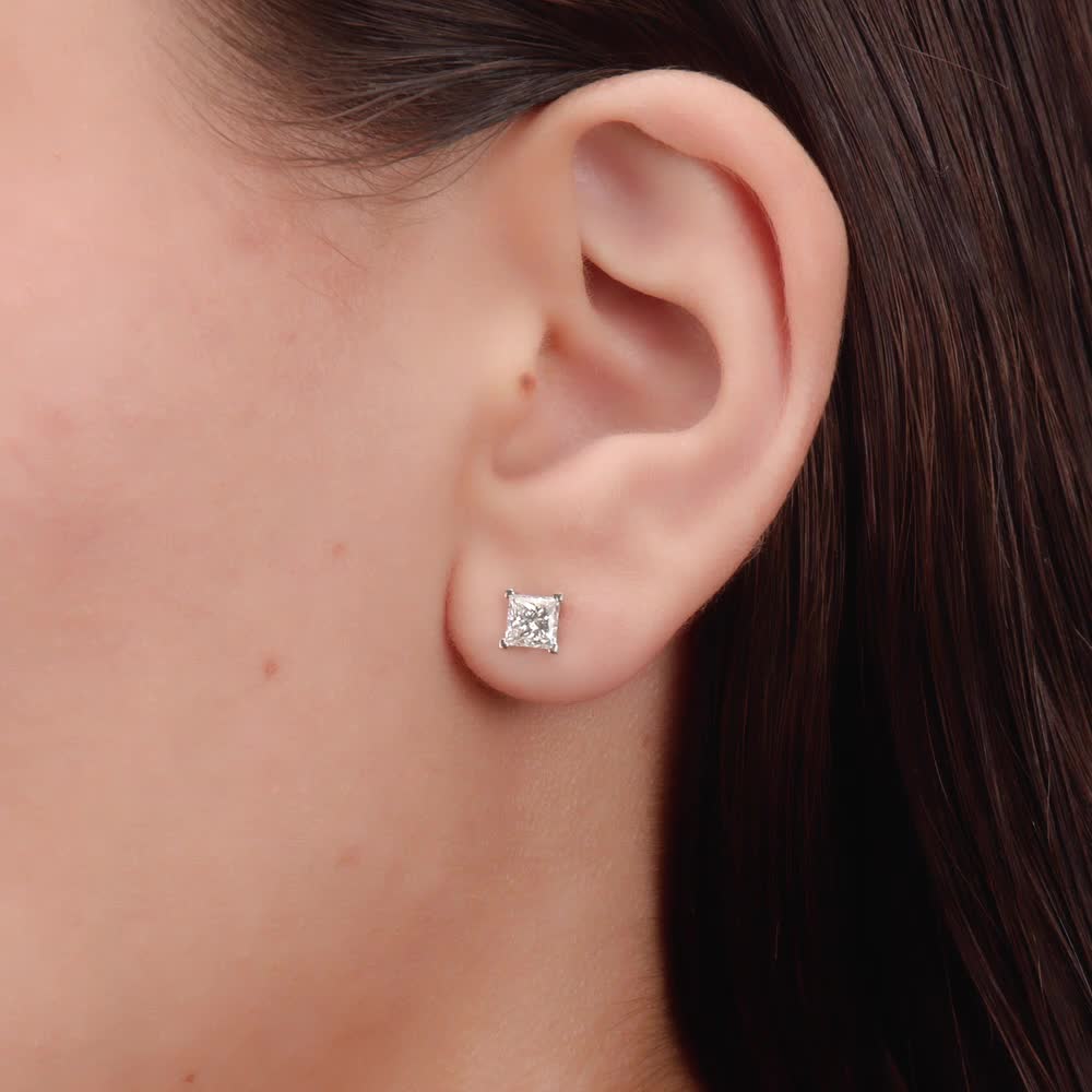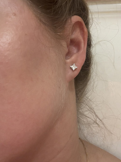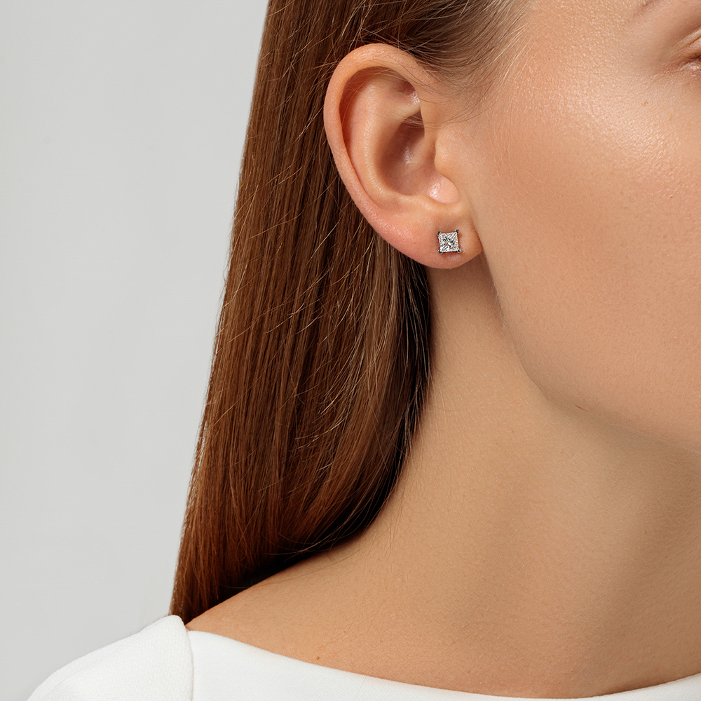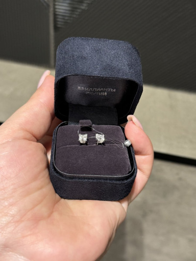 Серьги с 2 бриллиантами природными, 1.2 карат, огранка принцесса 65 граней, цвет 4, чистота 6, тип огранки А;