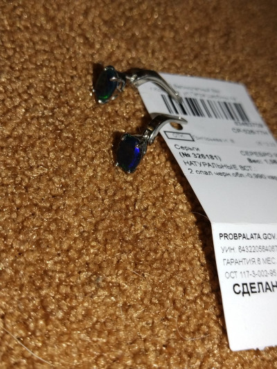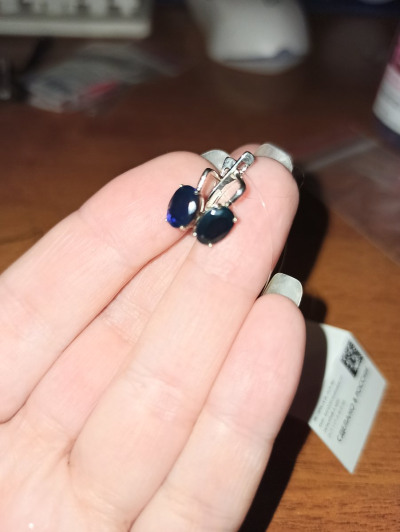 Милые миниатюрные серьги. На счёт камней большие сомнения, нет искорок других цветов не на свет ни вспышкой фотоаппарата, к тому же один камень зелёный, а другой синий. К тому же на сайте серьги представлены в двух артиклах, а разницы внешней не видно, а сразница в цене существенная. Лучше подобные камни выбирать в салоне, а не покупать на сайте