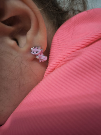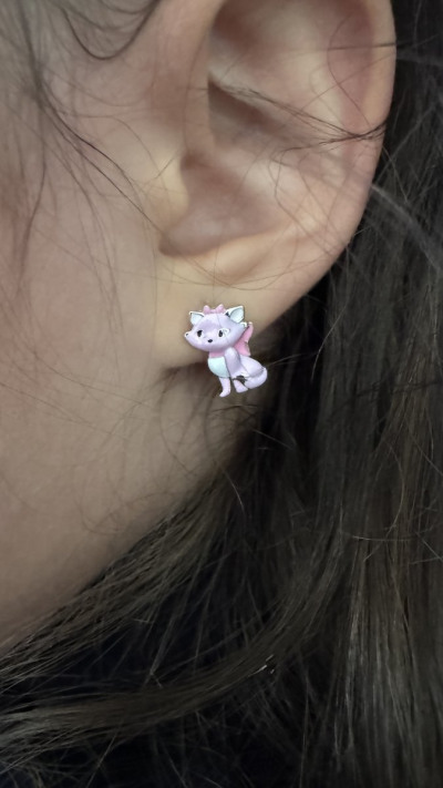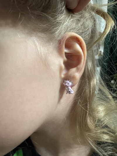 Дочка выбрала сама себе серьги, любимая кошечка Мари. Смотрятся стильно и красиво. Но долго носить не сможет, в 6 лет ещё чуть и будет давить мочку уха(
