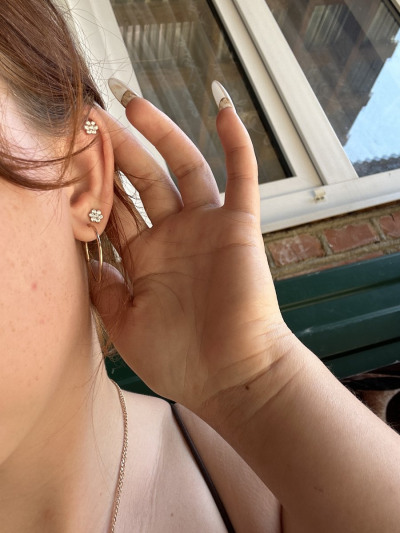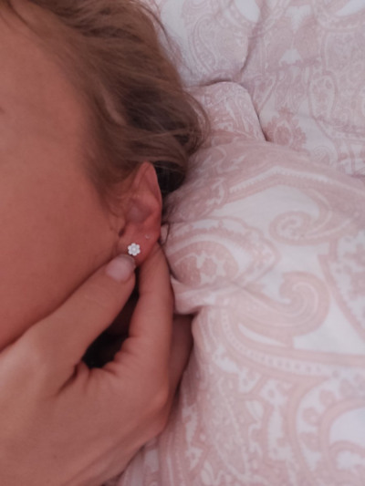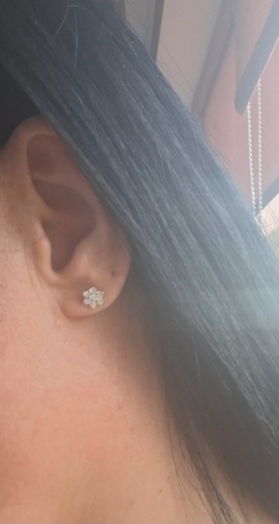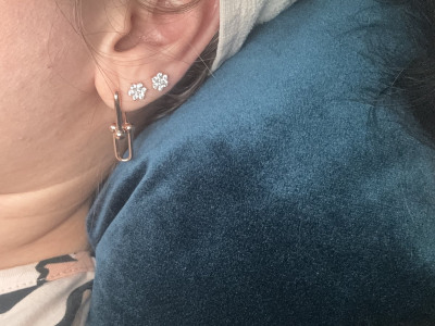 Очень нежные серьги. Винтовой замок плотно прилегает к уху, не провисают. Не тяжёлые, не колят, удобно спать, никуда не врезаются. Ношу в основных проколах , т.к. для вторых проколах все -таки большеваты. Среднего размера.