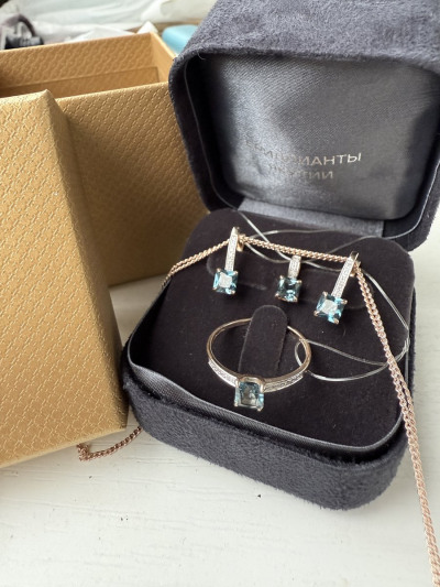 Присмотрелась к комплекту ещё в начале месяца, и реально думала, что придется ездить за ним по отдельности по всей Москве ) Но нет, все оказалось гораздо проще. Консультант (за которого вам надо держаться руками и ногами) все сама заказала, помогла, проконсультировала ) Сам комплект - фото с сайта не передает насколько он великолепен. Камешки чистенькие, не склейка, закреп прочный, огранка ровненькая, шлифовка и со внутренней стороны тоже. Бонусом паспорта и гарантия на все изделия.