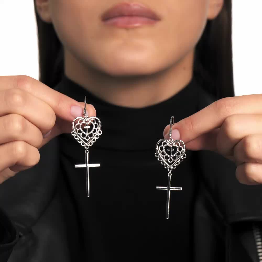Красивые серебряные серьги с сердцем и крестом, легкие. Не утяжеляют образ.