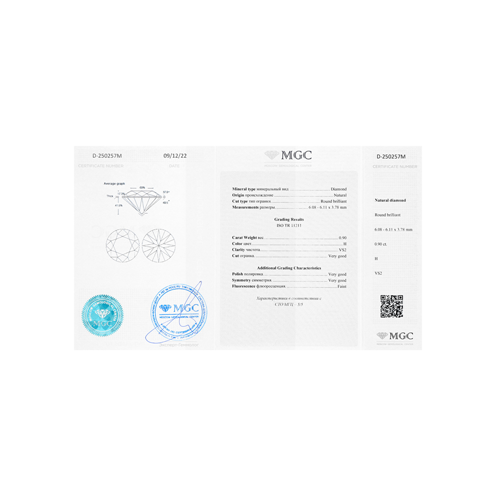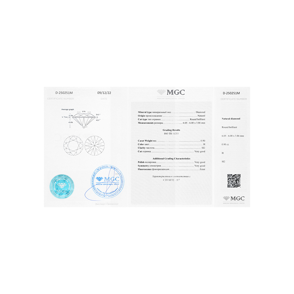 1 бриллиантом природным, 0.9 карат, огранка круг 57 граней, цвет 5, чистота 7, тип огранки А;