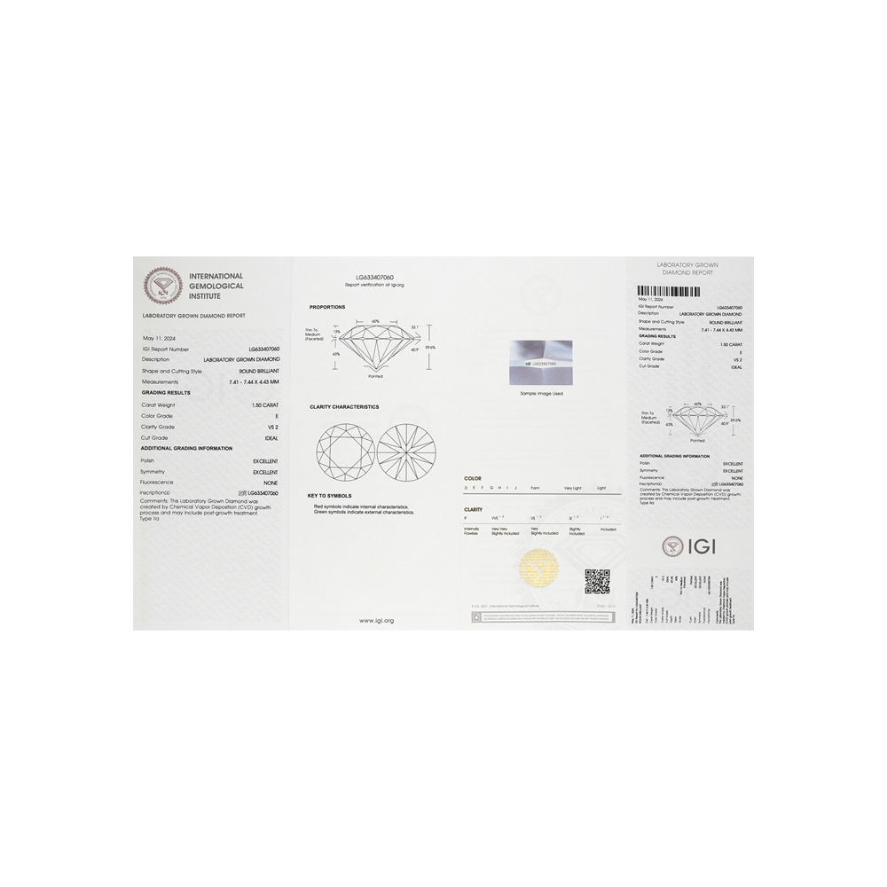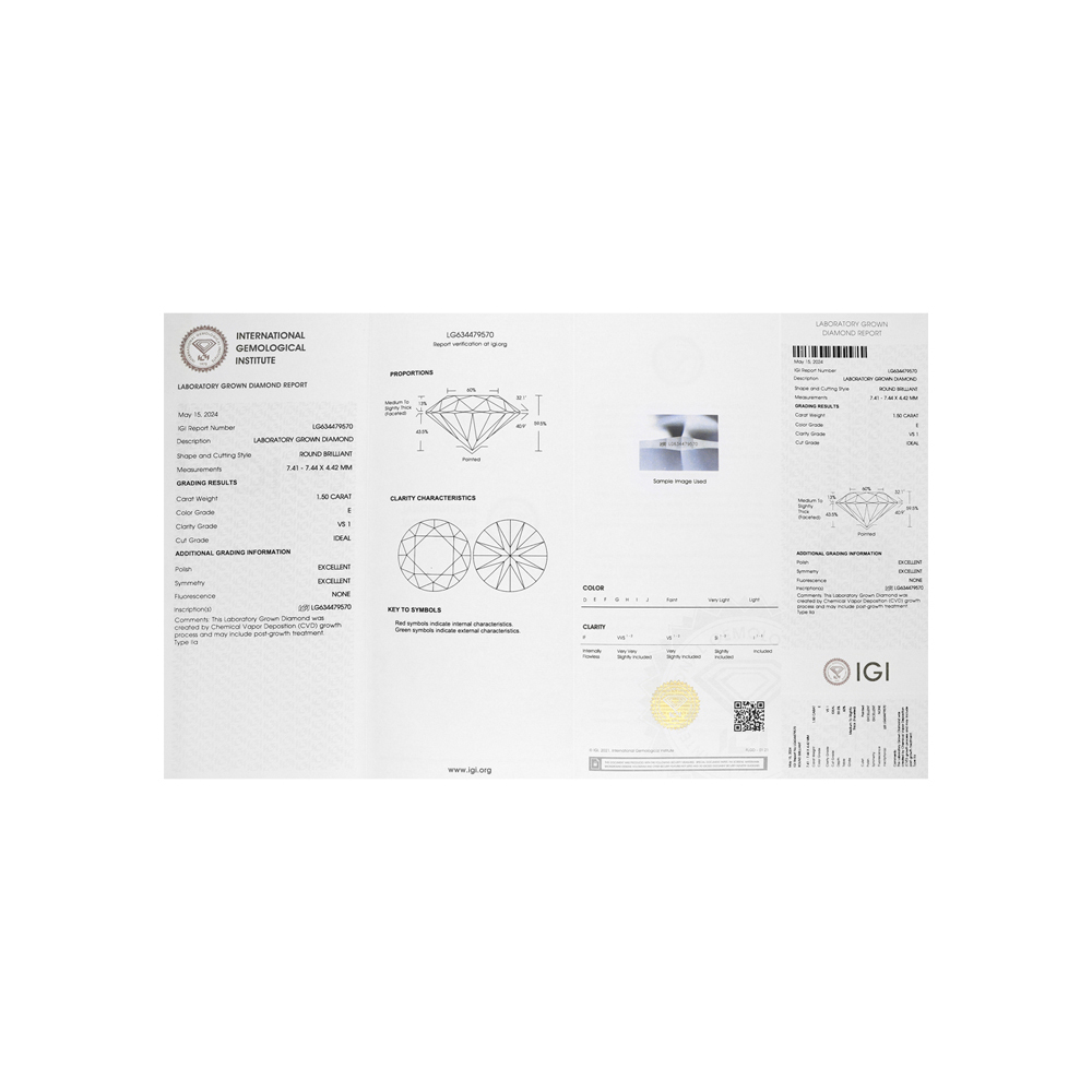 1 бриллиантом выращенным, 1.51 карат, огранка круг 57 граней, цвет 1, чистота 2, тип огранки А;