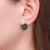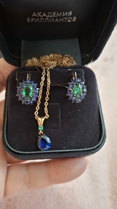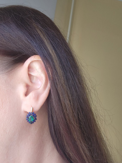 Золотые серьги с сапфирами выращенными и изумрудом выращенным