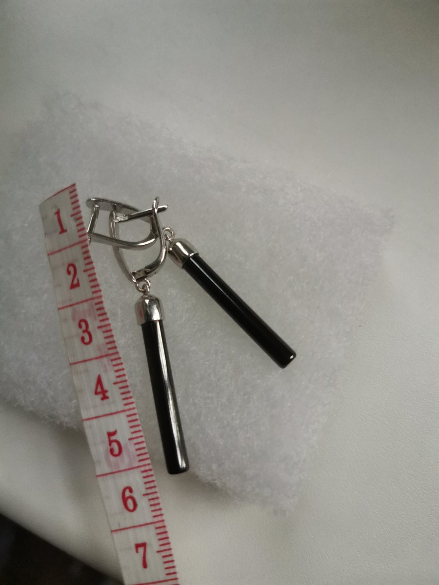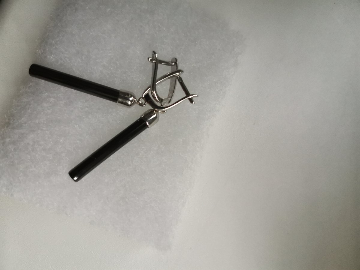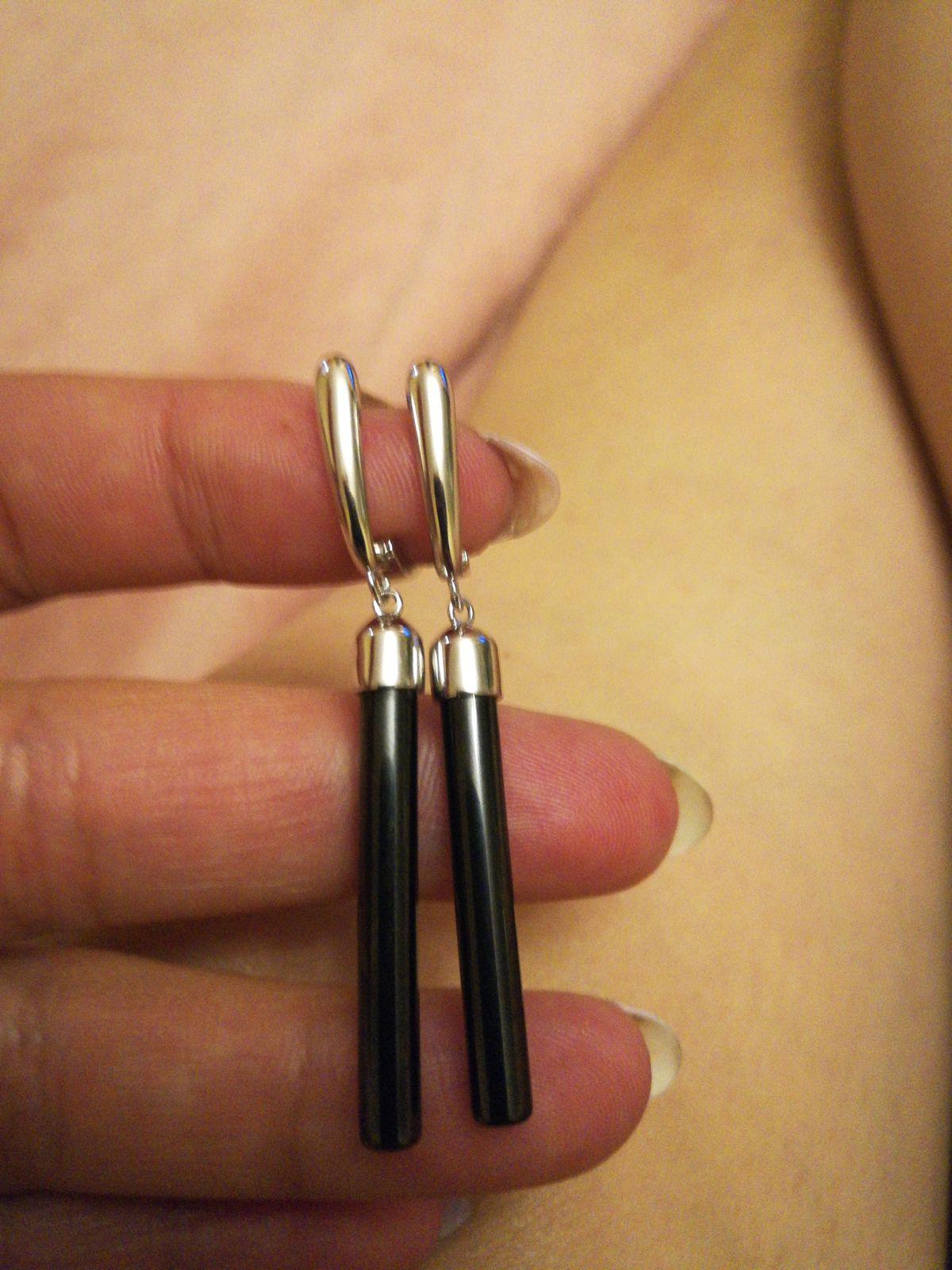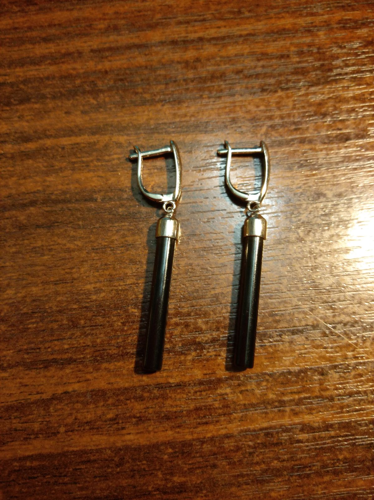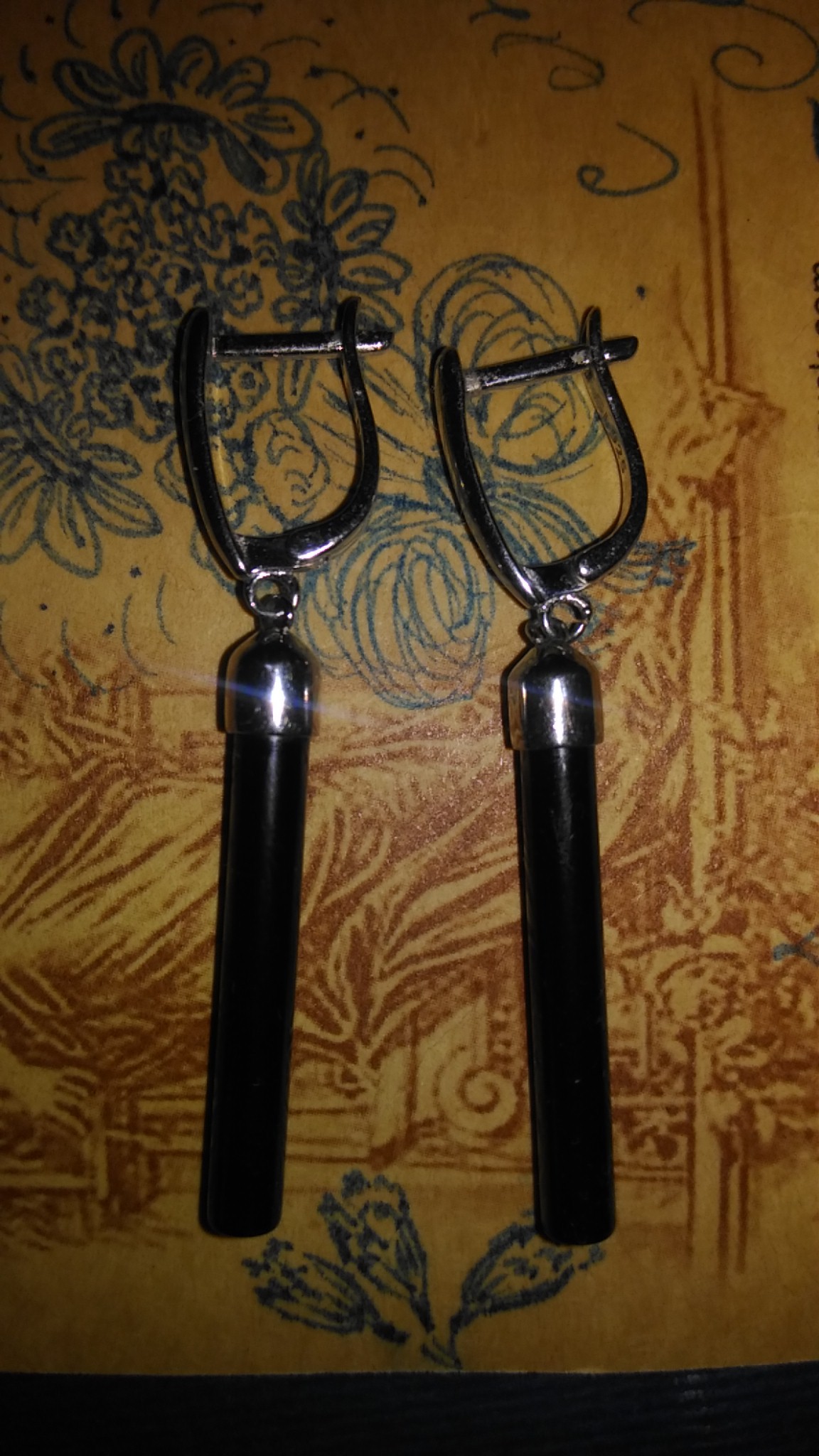 Эти серьги купила в пару к кулону в виде черной палочки с серебряной отделкой, долго искала и нашла здесь! получился чудесный комплект! серьги немного тяжеловаты, но в этом их прелесть, застежка хорошая, крепкая.Спасибо!
