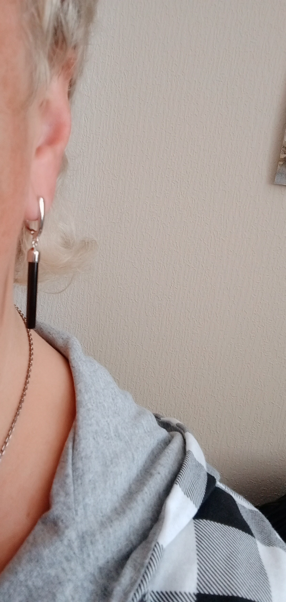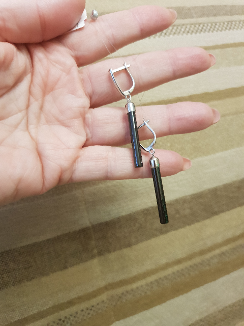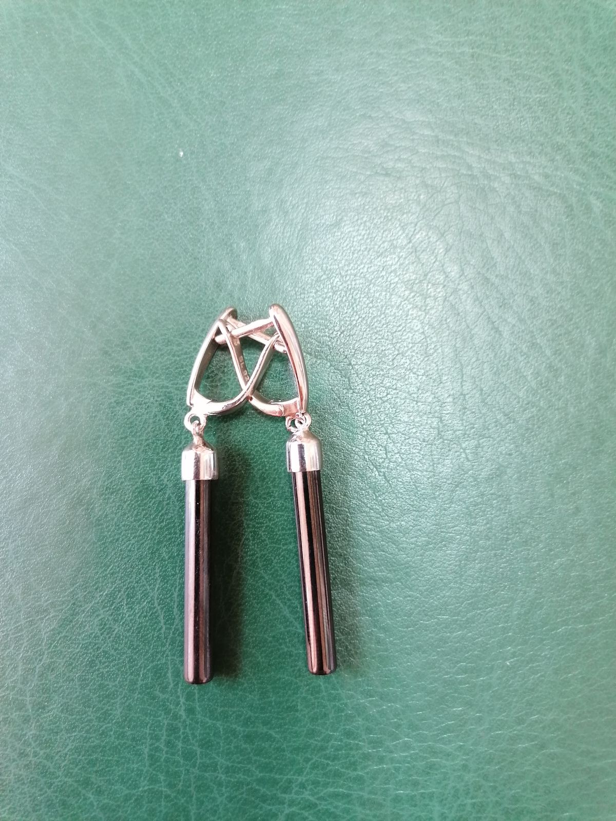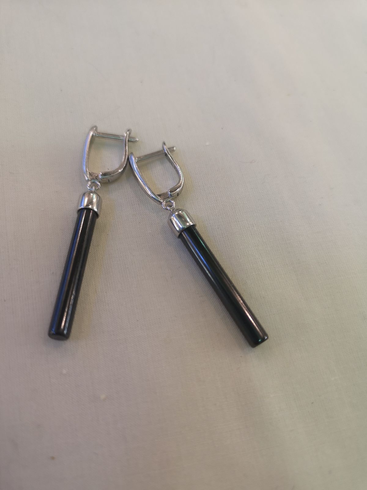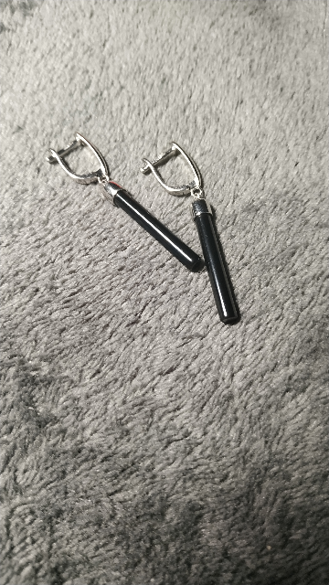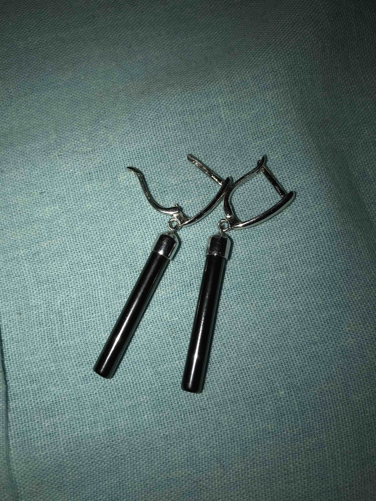 Эти серьги купила в пару к кулону в виде черной палочки с серебряной отделкой, долго искала и нашла здесь! получился чудесный комплект! серьги немного тяжеловаты, но в этом их прелесть, застежка хорошая, крепкая.Спасибо!