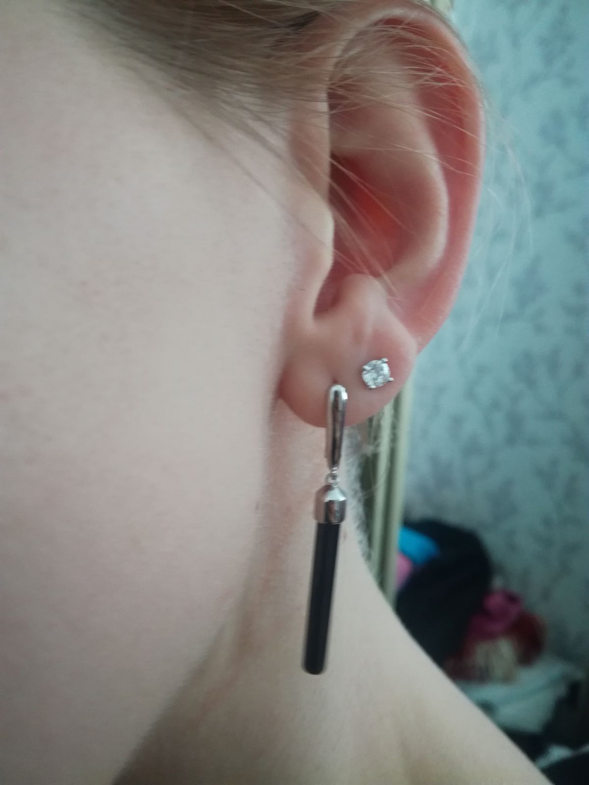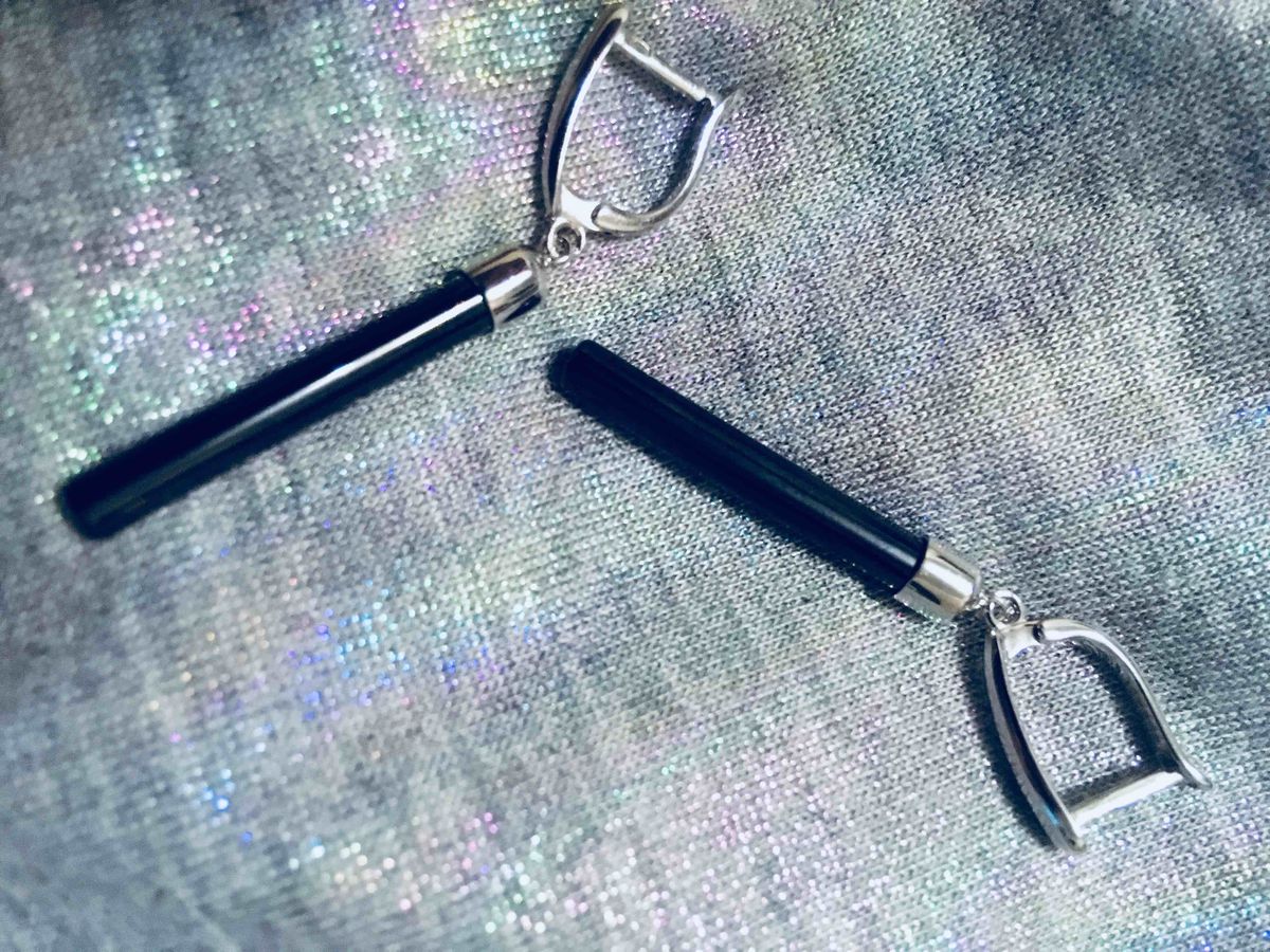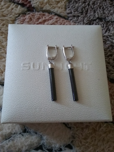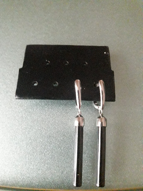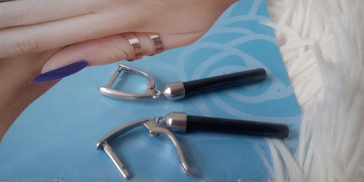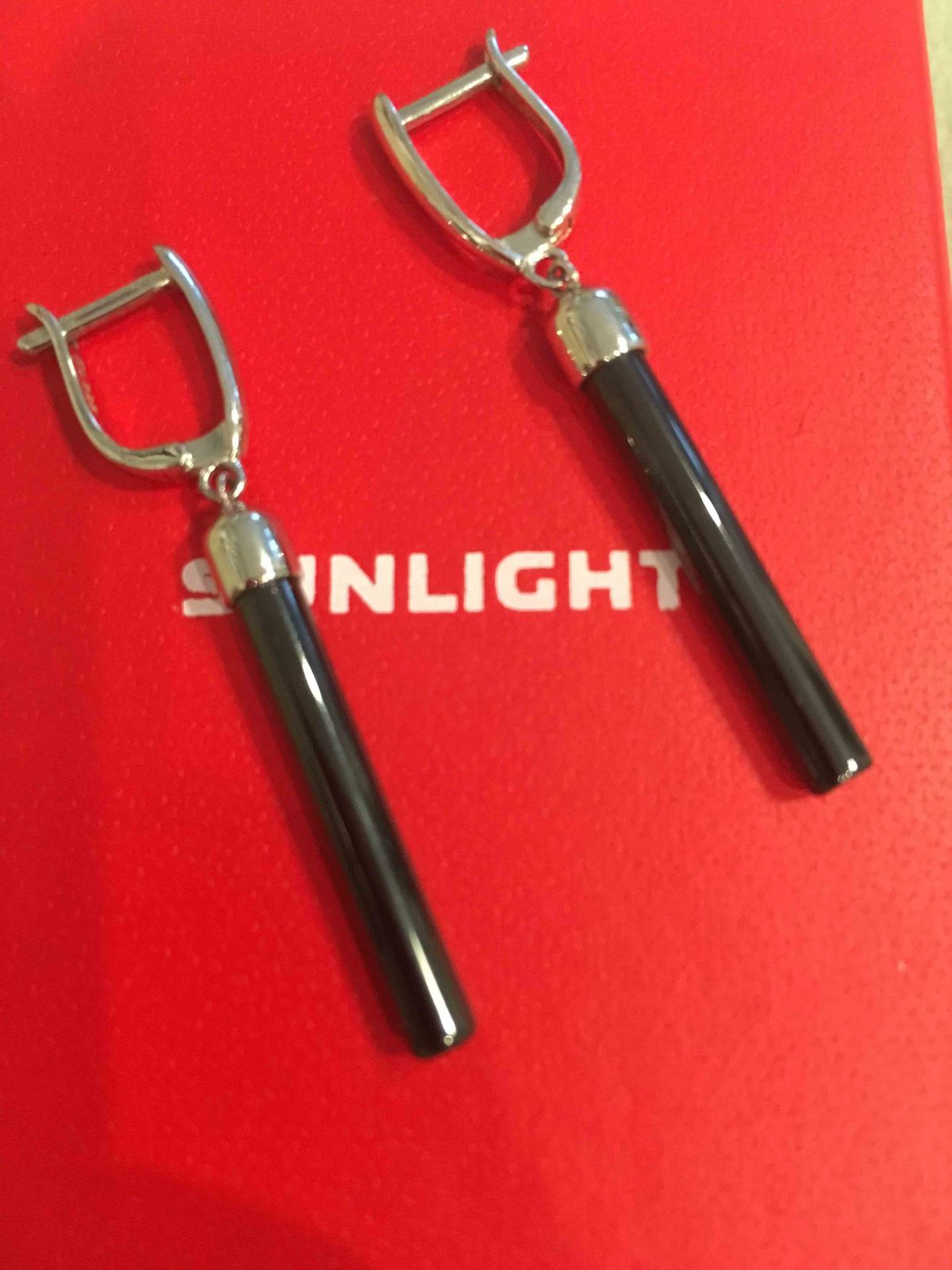 Эти серьги купила в пару к кулону в виде черной палочки с серебряной отделкой, долго искала и нашла здесь! получился чудесный комплект! серьги немного тяжеловаты, но в этом их прелесть, застежка хорошая, крепкая.Спасибо!
