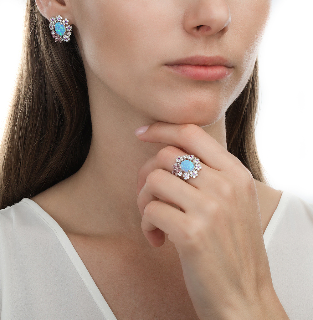 Серебряные серьги с фианитами, опалами природными и кварцами природными