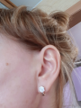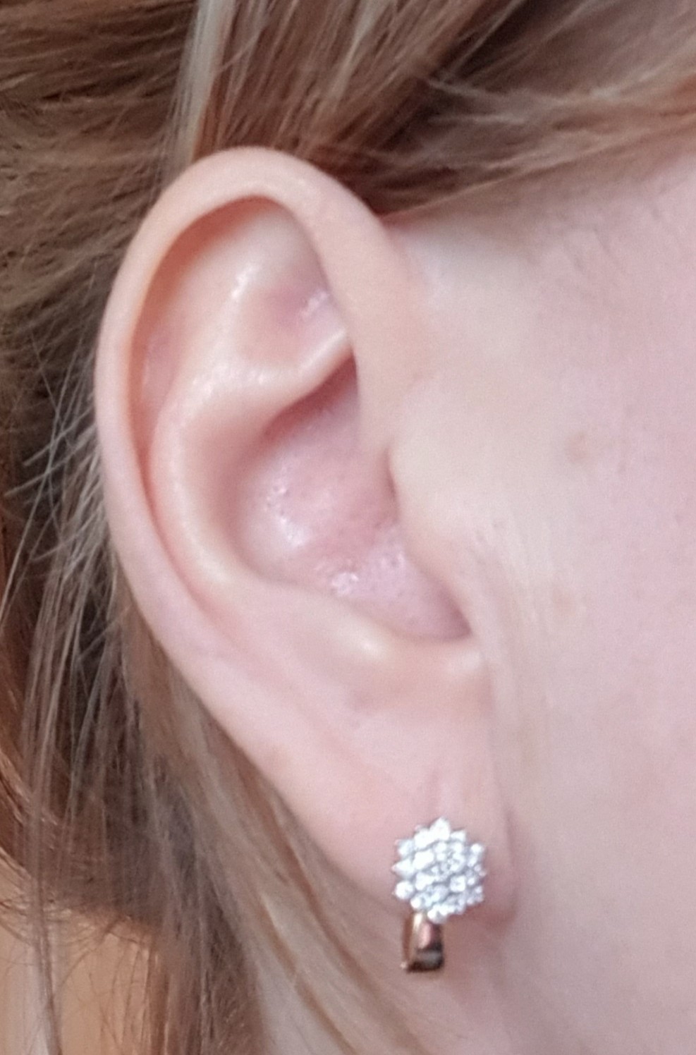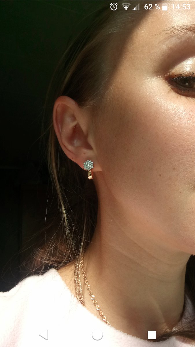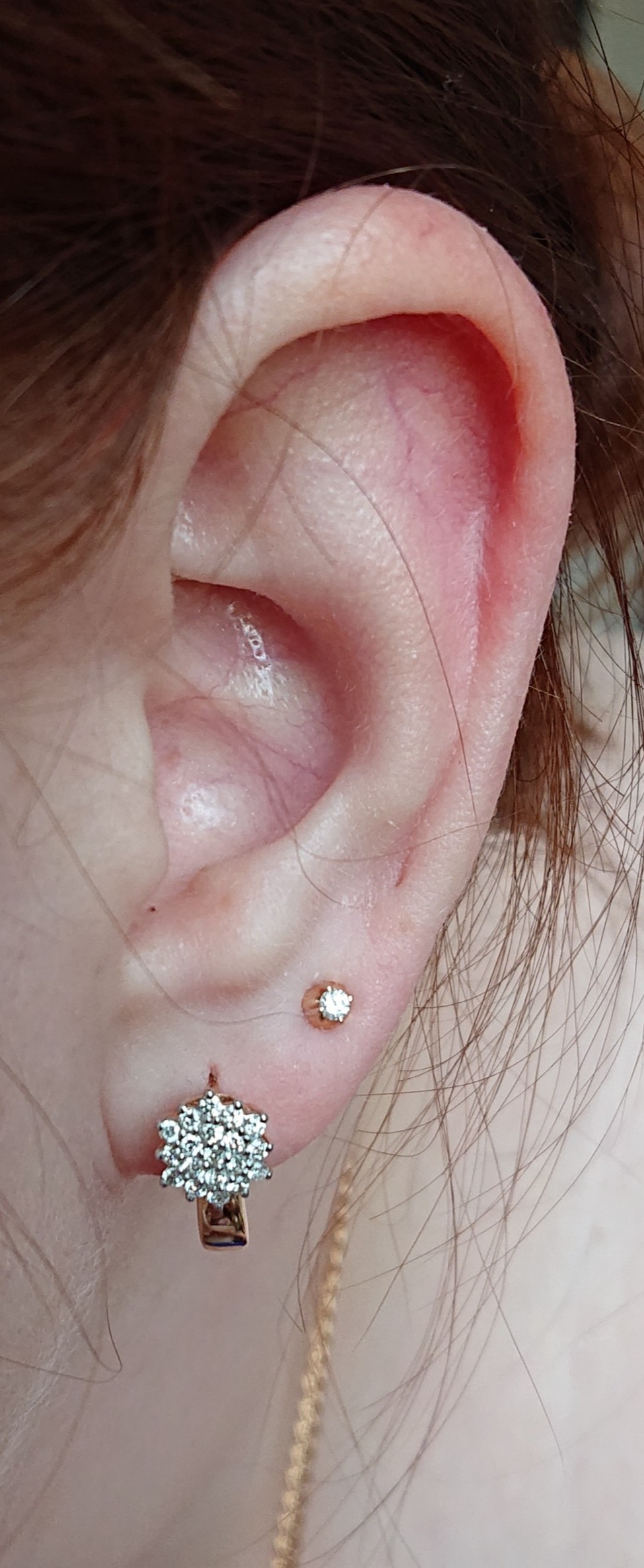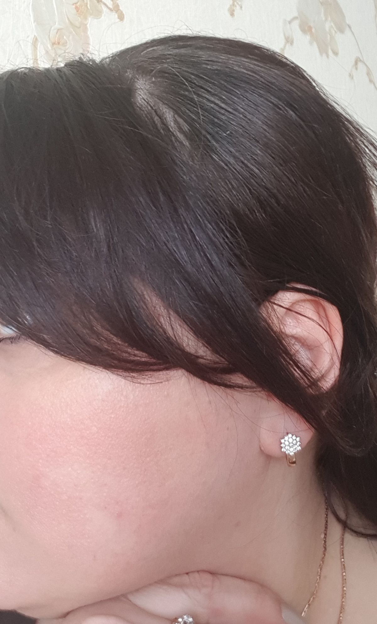 Сережки прямо на мои ушки, смотрятся очень красиво!!! Форма неординарная, застёжка плотно по мочки, что не мало важно! Бриллиантики смотрятся как один большой !!!Мерила много вариантов , но это лучше всего и невероятно красиво!!!