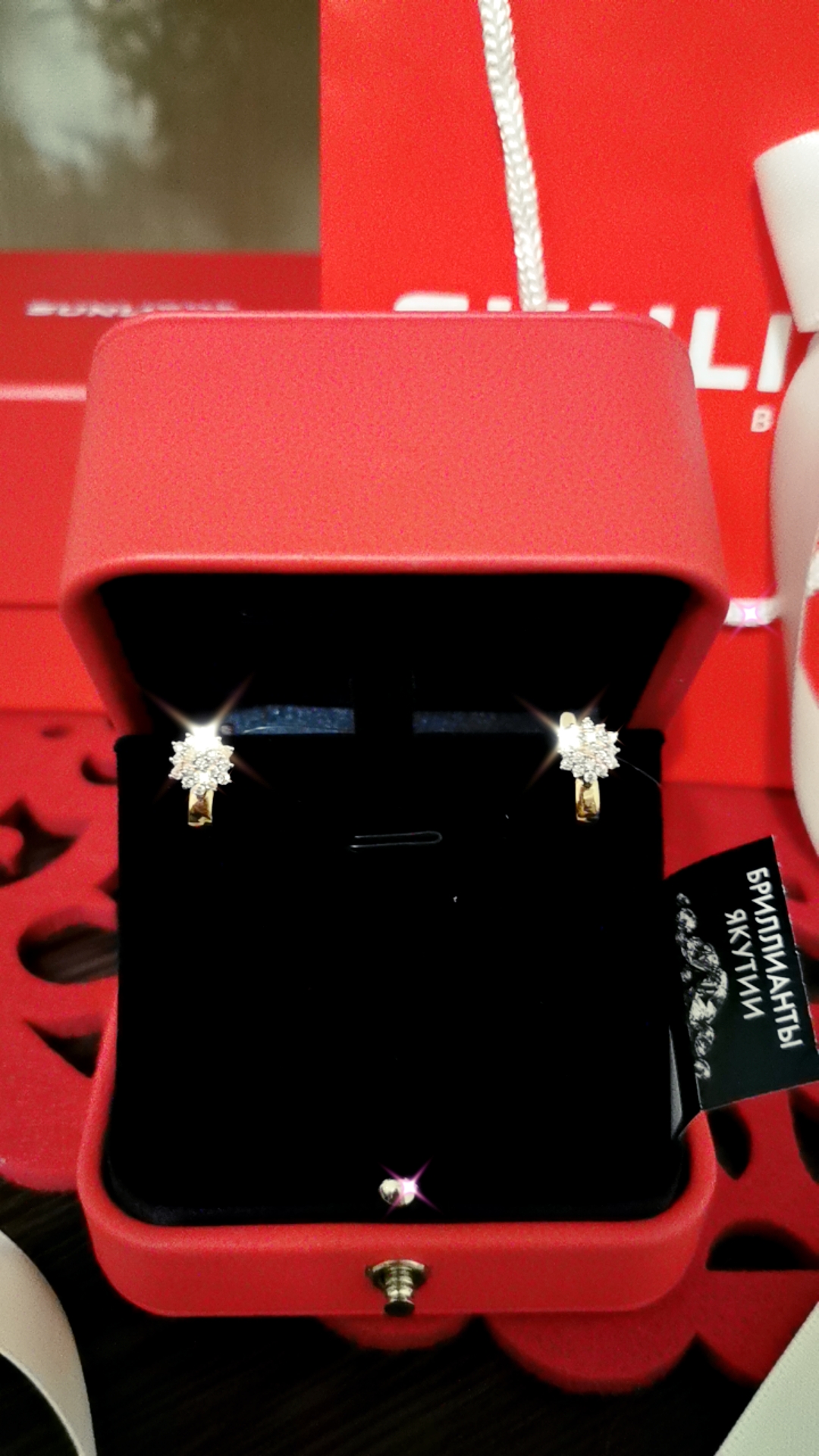 Шиканые сережки, бриллианты просто сияют разноцветными лучиками, пересмотрела много сережек, но такое сияние увидела только в якутских бриллиантах) на мои мочки подошли с силиконовой заглушкой, т.к.без них украшение чуть выпадает вперед. Очень крепкий отличный замочек, изделие просто шикарное!!