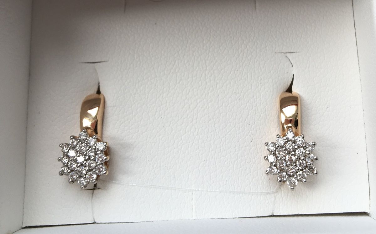 Обалденные сережки,заказала через интернет, забрала в магазине. Получился комплект, с колечком, которое муж подарил на 8 марта. Россыпь маленьких бриллиантиков отлично играет при дневном свете и вечером при освещении. Отличный магазин, красивые ювелирные изделия, приносящие немного радости в нашей интенсивной жизни.