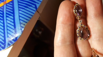 Золотые серьги с аметистом и с аметрином одновременно. Смотрятся на ушке красиво. Удобный замочек. С одеждой в феолетовых тонах хорошо комплектуют.