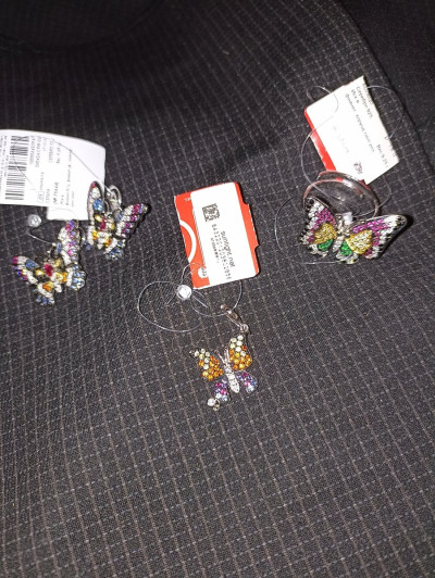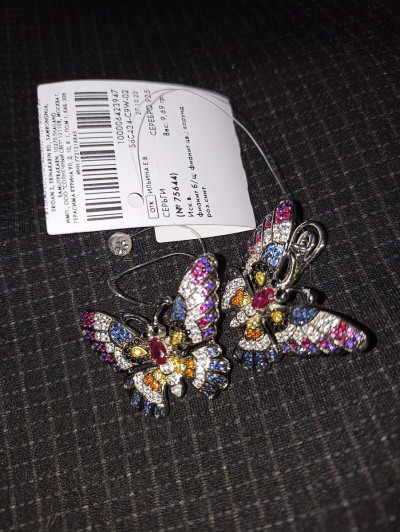 Очень красивые серьги. Яркие. Камни переливаются разными цветами. К серьгам купила кольцо с бабочкой и кулон с бабочкой. Цвета отличаются, но тем не менее вместе смотрятся как комплект. Я очень довольна. Спасибо Санлайт!