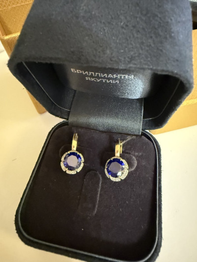 Золотые серьги с бриллиантами природными и сапфирами выращенными