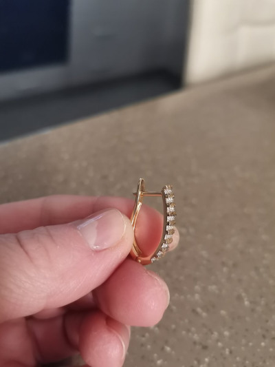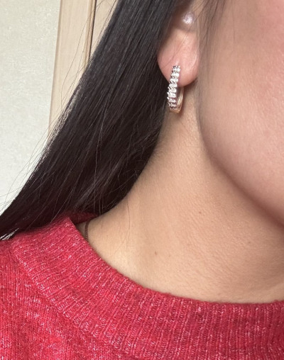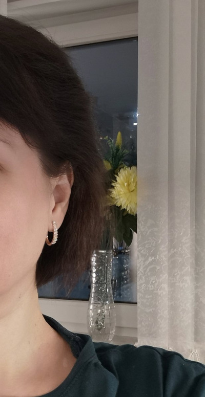 Симпатичные серьги, очень блестят за счет огранки и включения бриллиантов. Порадовала посадка на ухе. Мочка у меня тонкая, но серьги сели хорошо, вперед не заваливаются.