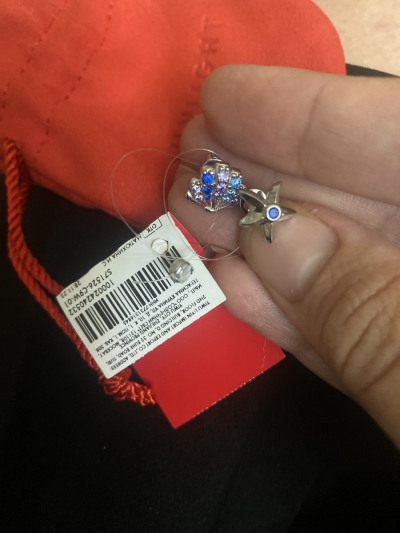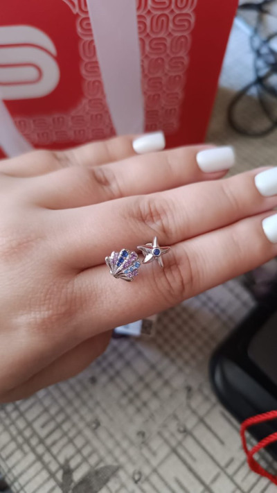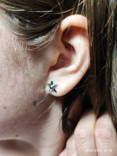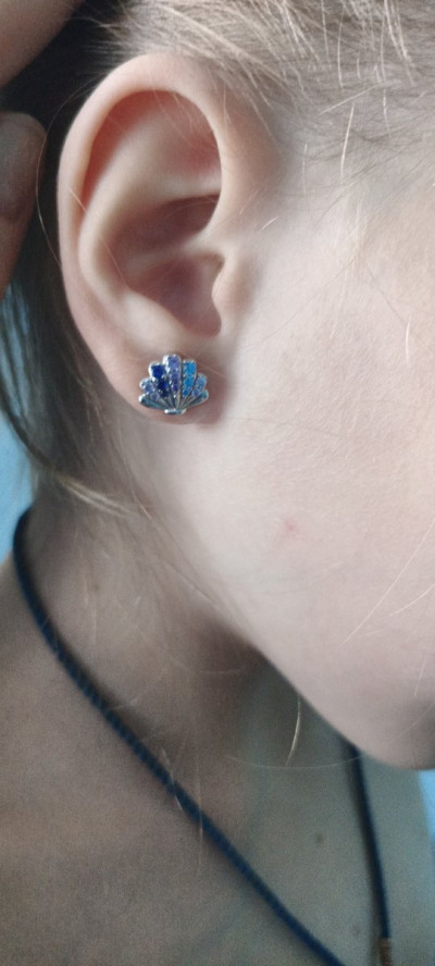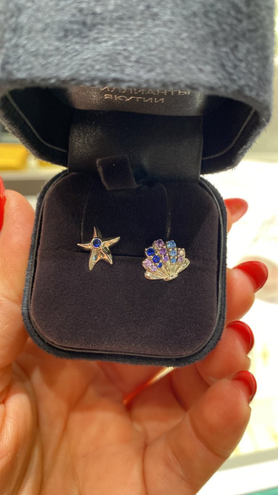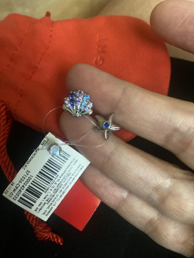 Купила дочке на 8е марта. Одна серьга в виде морской звезды, другая - ракушка. Отлично смотрятся, удобный винт.