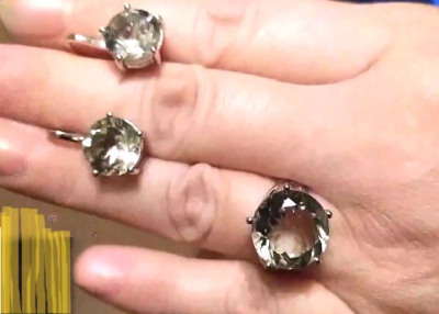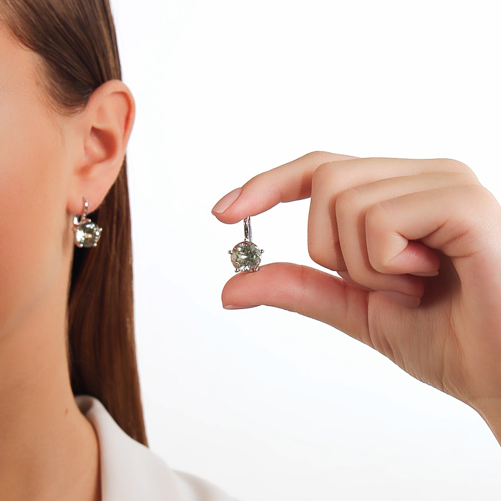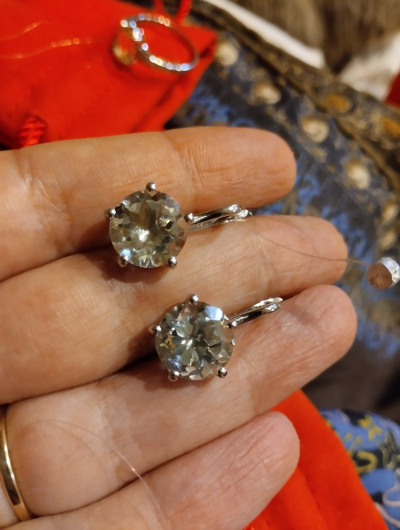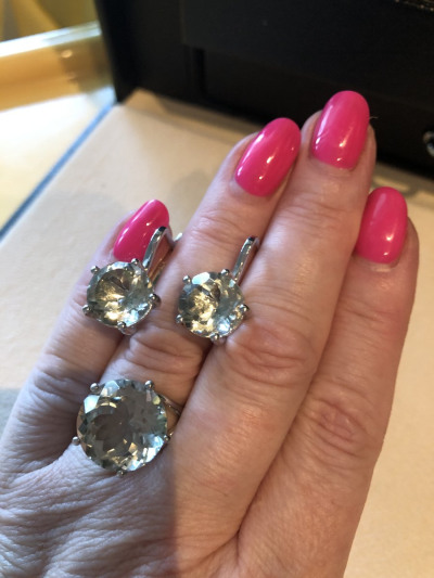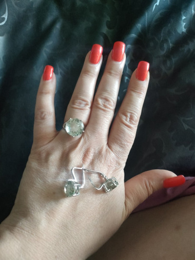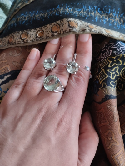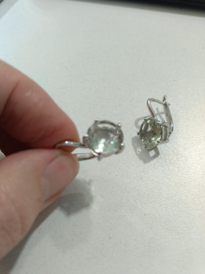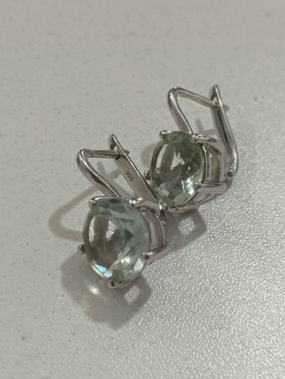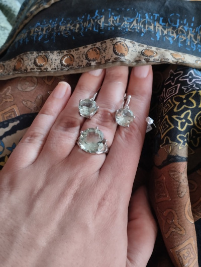 Крупные, тяжёлые серьги с зеленым аметистом. Покупала в комплект к кольцу. Смотрятся отлично, переливаются на свету, не громоздкие, если мочка тонкая могут слегка перевешивать. Можно даже спать в них, совершенно не мешают. Цвет нежно зеленый, как озерная вода.