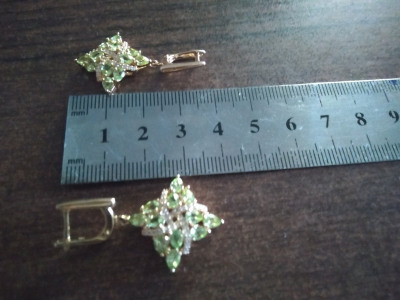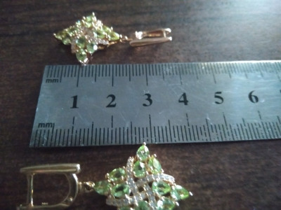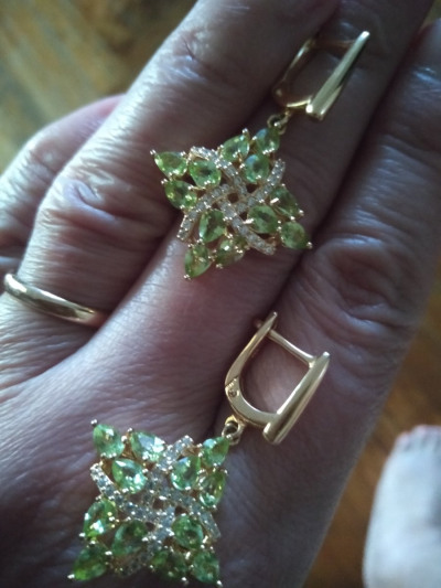 Серьги очень красивые, хризолиты яркие, ромбовидная форма серёг, лимонная позолота, они качаются на ухе, сияют ещё и благодаря фианитам.