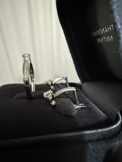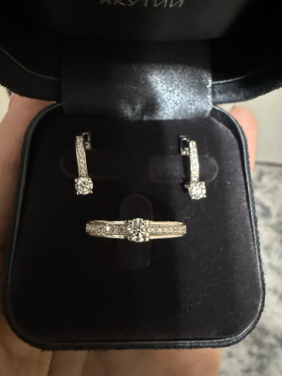 Шикарный набор, бриллианты блестят при свете, фото не передает этот блеск. Рекомендую к покупке. От белого золота не отличить.
