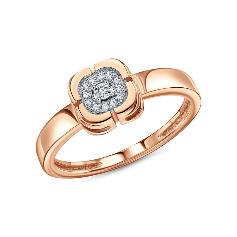 Кольцо с 1 бриллиантом природным, 0.004 карат, огранка круг 57 граней, цвет 3, чистота 6, тип огранки А; 12 бриллиантами природными, 0.03 карат, огранка круг 17 граней, цвет 2, чистота 2, тип огранки А; Розовое и белое золото 585 пробы.