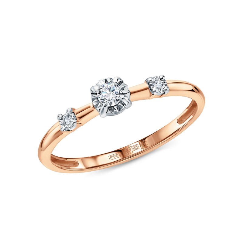 Кольцо с 1 бриллиантом природным, 0.06 карат, огранка круг 57 граней, цвет 3, чистота 6, тип огранки А; 2 бриллиантами природными, 0.007 карат, огранка круг 17 граней, цвет 2, чистота 2, тип огранки А; Розовое и белое золото 585 пробы.