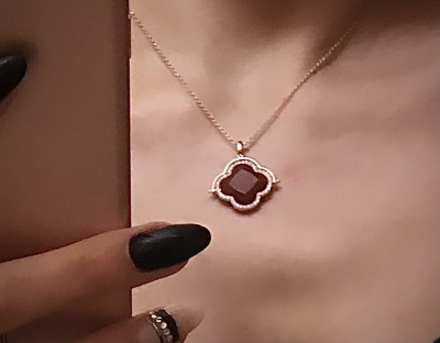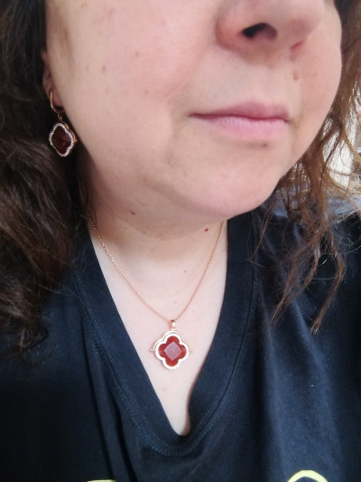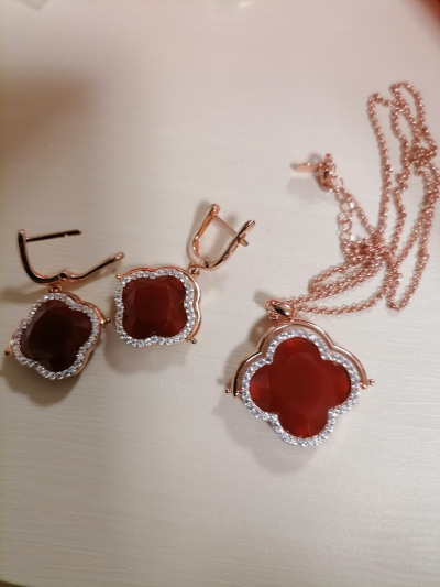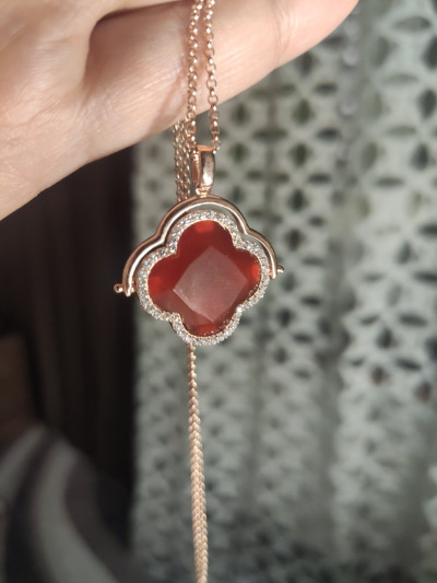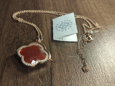Долго сомневалась, глядя на фото. Как увидела - сразу влюбилась. Крупный красный агат правильно оформлен - не лежит на подложке, с обеих сторон соприкасается с кожей - это важно для тех, кто ценит натуральные камни за их свойства, а не носит только как украшение. Хорошо огранен, при смене освещения играет цветами в палитре от тицианового до бордо. С одной стороны обрамлен россыпью фианитов (иск.), с другой позолоченным ободком. Можно носить по-разному, с каждой стороны красиво. Родная цепь не снимается, но регулируется по длине. Заметное и, вместе с тем, спокойное изделие. Подойдет и на каждый день, и в праздник тоже без внимания не останется.