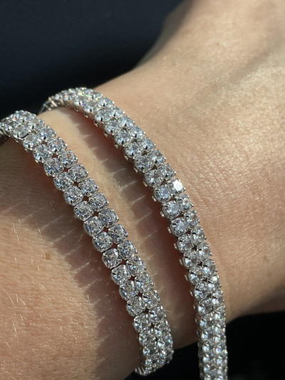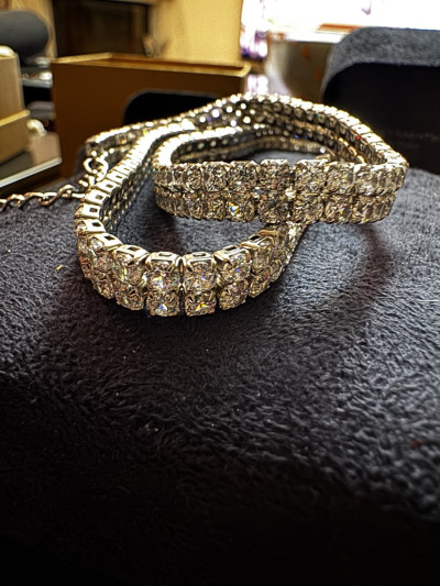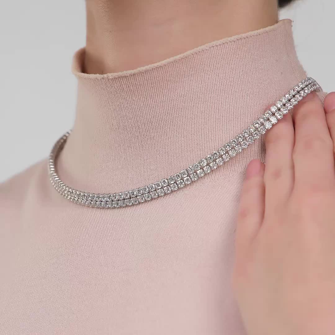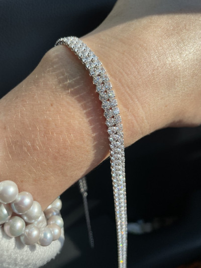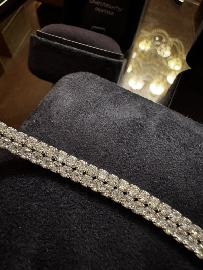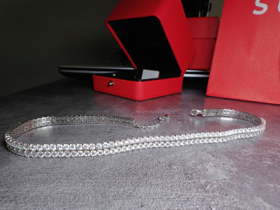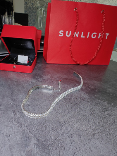 Блеск фианитов ослепляет. Колье жесткое, поэтому лучше брать размер без запаса, иначе не ляжет. Пожелание для магазина - упаковку для таких вещей. Выбирала из 4 изделий и только одно было без деформации с спаек.