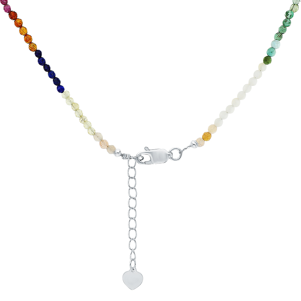 Серебряное шейное украшение с лазуритом, корундом, бирюзой, родонитами, бериллом, гранатами природными и апатитами