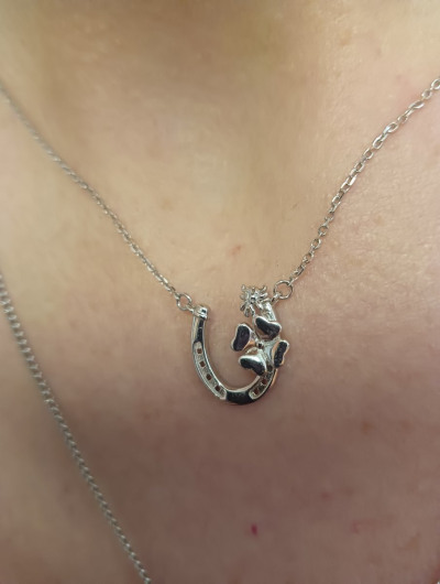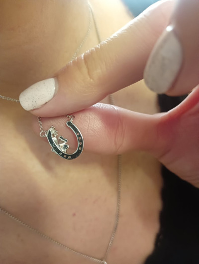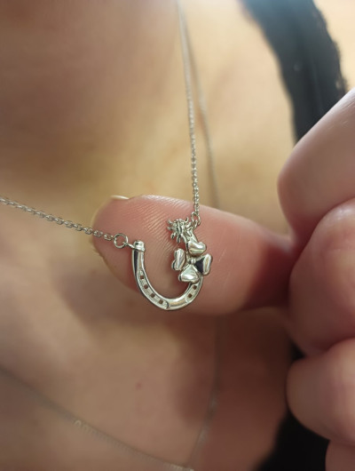 Подвеску смотрела онлайн, но тогда не привлекла внимание, а когда увидела в магазине, захотелось купить. Понравилось необычное крепление цепочки без ушка на подвеске. Единственное, что не нравится - дырочки на подкове, хотя они вроде как имитируют настоящую подкову.
