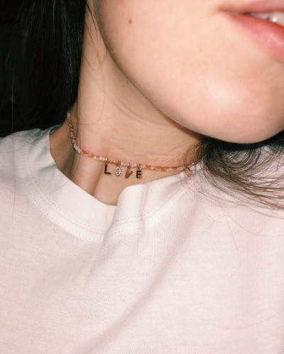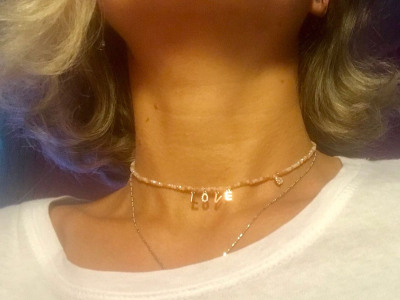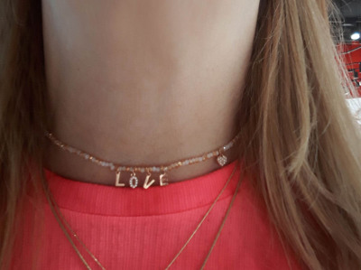 Очень приятное украшение, модное, буковки LOVE блестят, камешки приятного янтарного цвета, но на детскую шейку. Или можно носить как чокер.