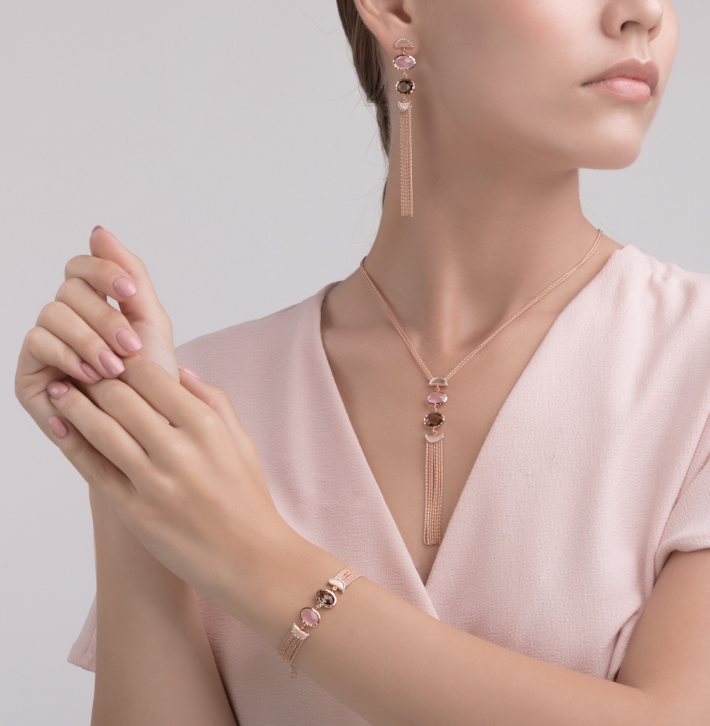 Золотое шейное украшение с раухтопазом и кварцем