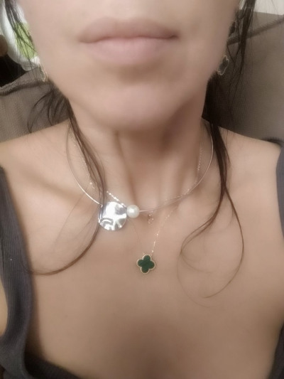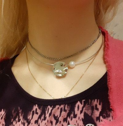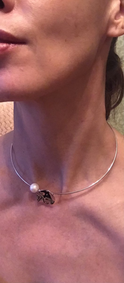 Давно хотела такой твердый чокер из серебра. Удобно что на застежке - фиксируется как надо по окружности шеи. Если бы еще подвесы были сьемные, цены бы не было этому колье. У любой девушки найдется множестао подвесок - каждый день новый образ. Теоретичеки можно снять украшения с колье , но для этого нужно отсоединить цепочку удлинения. Оставила пока, потом может сниму, чтобы был базовый чокер под мои подвески.