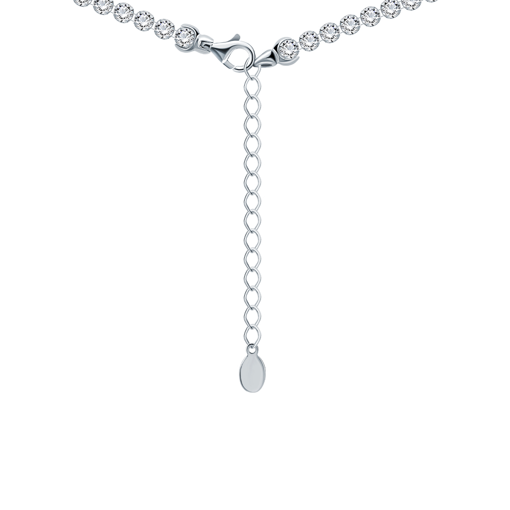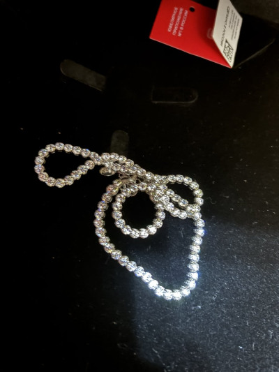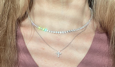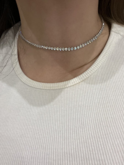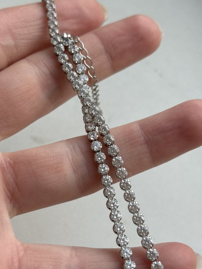 Шикарный чокер с фианитами, купила к аналогичному браслету, сияют на освещении, не темнеет, советую к покупке, все спрашивают где купила🥲