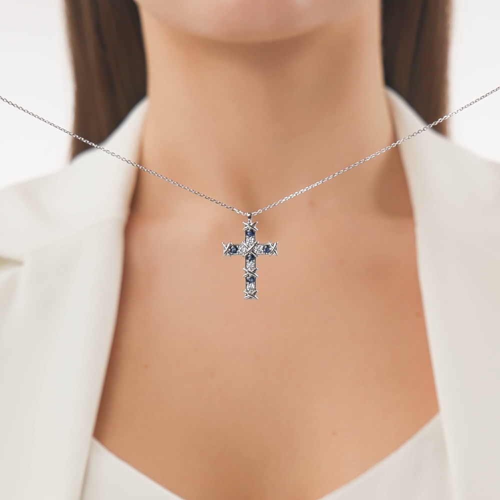 Серебряное шейное украшение с фианитами и сапфирами природными