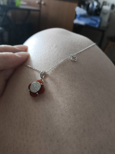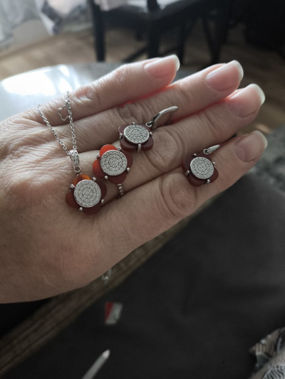 Натуральный сердолик, мне по душе. С блестящей серединкой, в серебре. Милая штучка. В комплекте смотрится интересно. Преобрела всё.