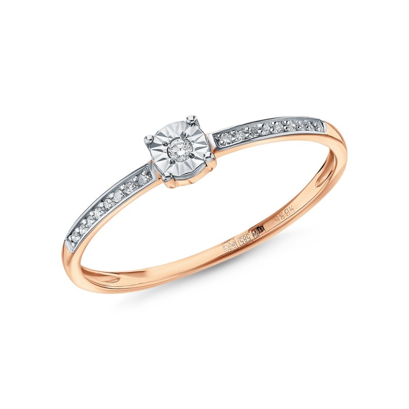 Кольцо с 1 бриллиантом природным, 0.01 карат, огранка круг 57 граней, цвет 3, чистота 6, тип огранки А; 16 бриллиантами природными, 0.03 карат, огранка круг 17 граней, цвет 2, чистота 2, тип огранки А; Розовое и белое золото 585 пробы.