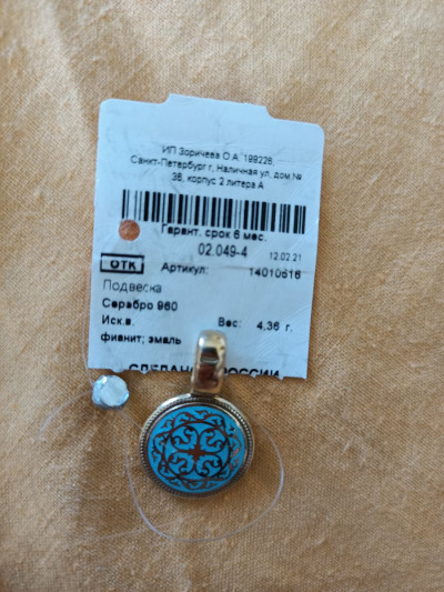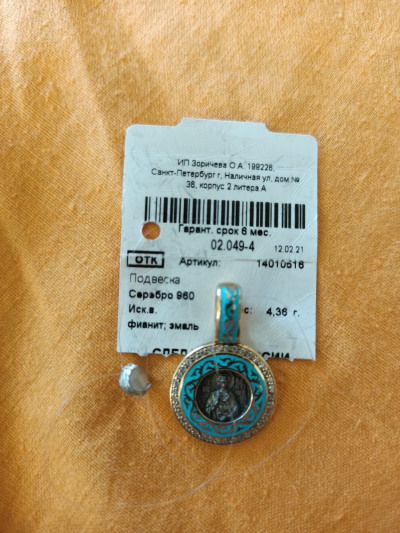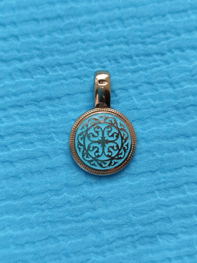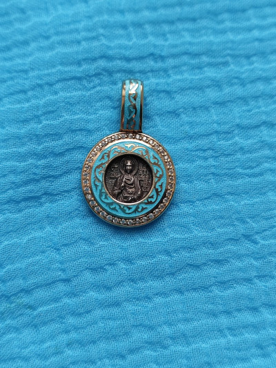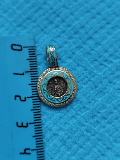 Подвеска очень позитивная.В центре изделия расположен Святой Пантелеймон.Далее по кругу идёт бирюзовый фон с золотистым орнаментом.По последнему кругу расположены фианиты Размер изделия в диаметре 1,5 см.Производитель Санкт-Петербург.Проба серебра 960,редкая.