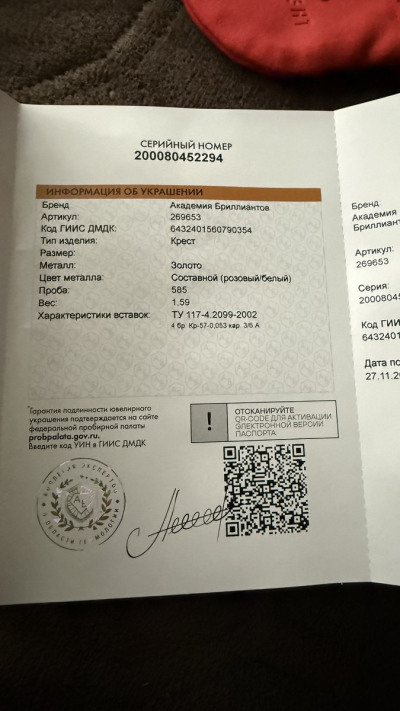 Выбирала крестик не большой, но и не маленький. Глаз остановился именно на этом. Он превосходный, бриллиантики сверкают, очень интересная задумка крестика, в меру ажурный. Спасибо консультанту Маргарите в подборе изделия. Магазин из которого точно не уйдешь без покупки, да и цены приемлемые. Паспорт на пожизненную гарантию. Спасибо