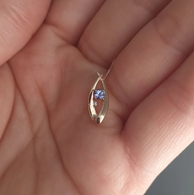 Долго думала между другой и этой подвеской. В итоге выбор пал на эту. Хоть камни в ней менше, но смотрится она более изящней и богаче. Бриллиант на фоне танзанита почти незаметен (прям кроха). В зависимости от освещения танзанит переливается от тëмно-голубого до прозрачного с светло-голубым оттенком. Подбирала на тонкую цепочку купленную в этом же магазине. В пробирной палате УИН пробивается. Камни натуральные. Золото 585 пробы.