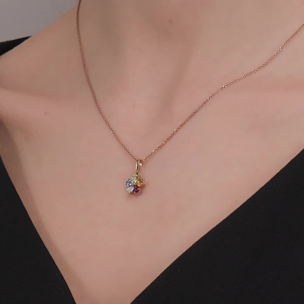 Эта подвеска в виде цветка с полудрагоценными камнями и бриллиантами олицетворяет красоту жизни, обновление, гармонию природы и магию четырех стихий: огня (цитрин), воды (топаз), воздуха (хризолит) и человеческой души (аметист). Фиолетовый аметист символизирует духовность, мудрость и защиту, помогает найти внутренний покой, развивает интуицию и оберегает от негатива. Желтый цитрин – камень солнца и энергии – приводит к удаче, изобилию и помогает достижению целей, заряжает оптимизмом и уверенностью. Голубой топаз сохраняет ясность ума и искреннюю коммуникацию, помогает раскрыть творческий потенциал, поддерживает романтические связи. Зеленый хризолит – минерал процветания и здоровья – способствует эмоциональному равновесию, создает ощущение счастья. Бриллиант – символ вечности, чистоты и силы. Он поддерживает влияние всех остальных камней, создавая энергетическое единство, и приносит своему владельцу гармонию и уверенность в себе.