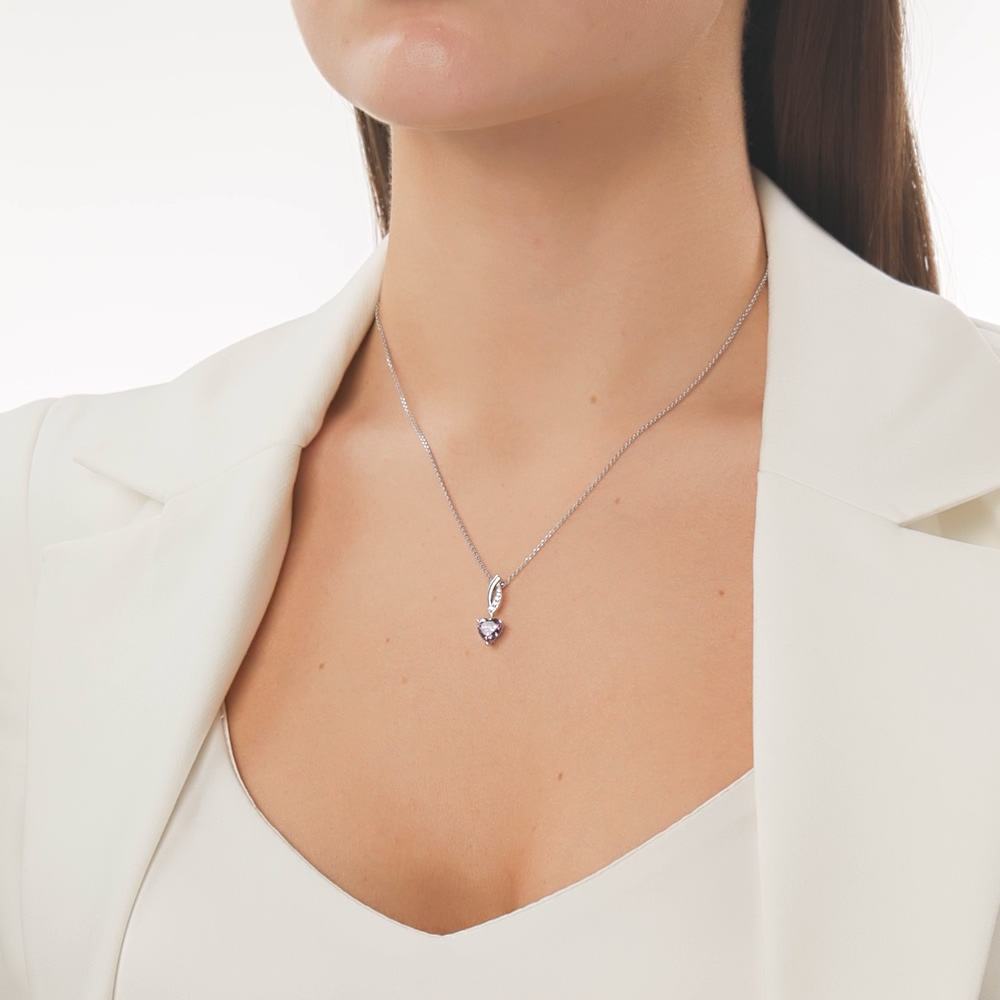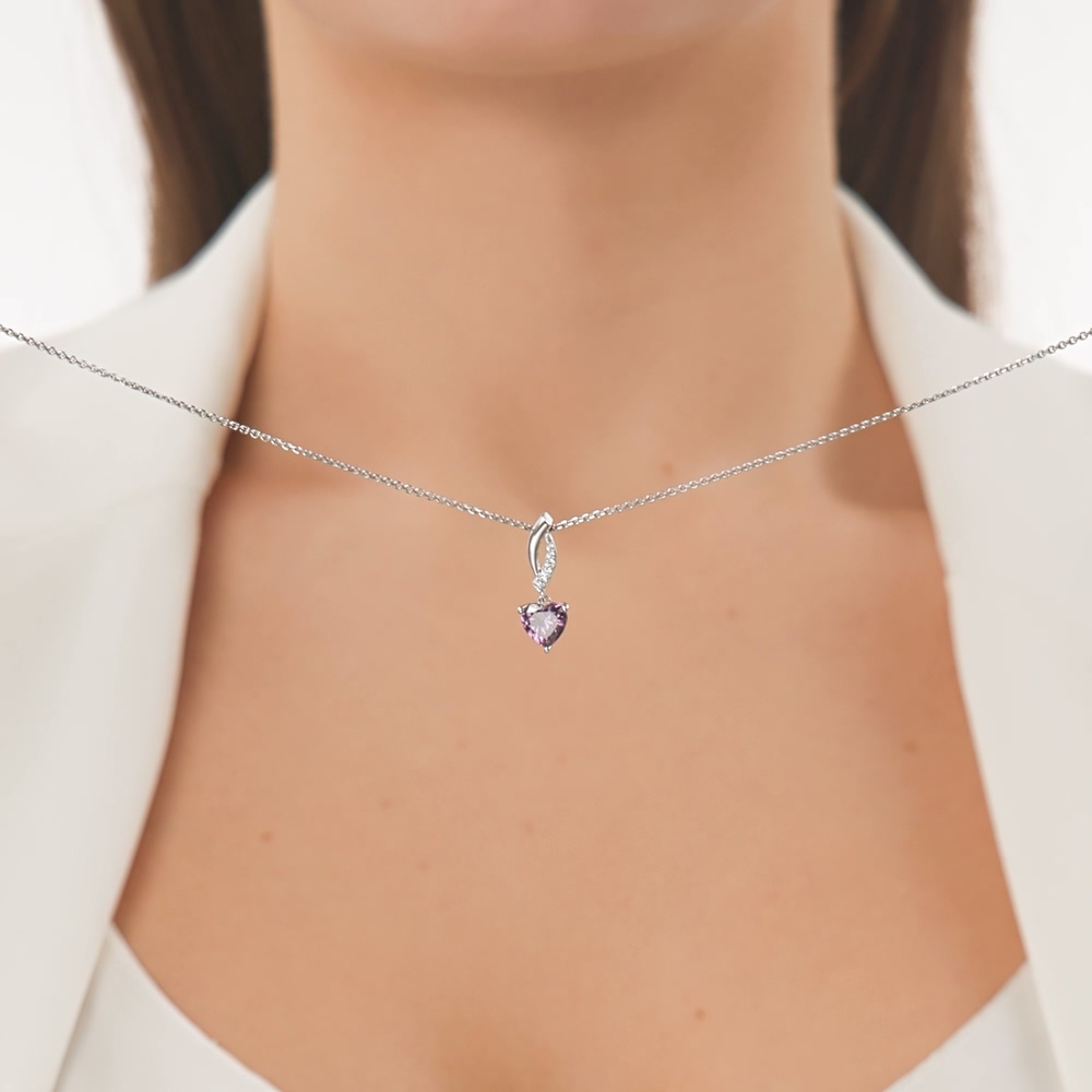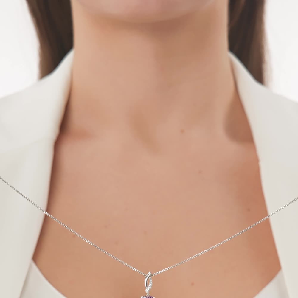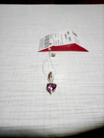 Небольшой элегантный кулончик. В комплекте есть ещё кольцо и серьги. У меня кулон и кольцо. Размер и цвет камня совпадает в них. Мне повезло) Выглядит нарядно и дорого! Замечательная идея для подарка! (Если девушка любит фиолетовый цвет)).