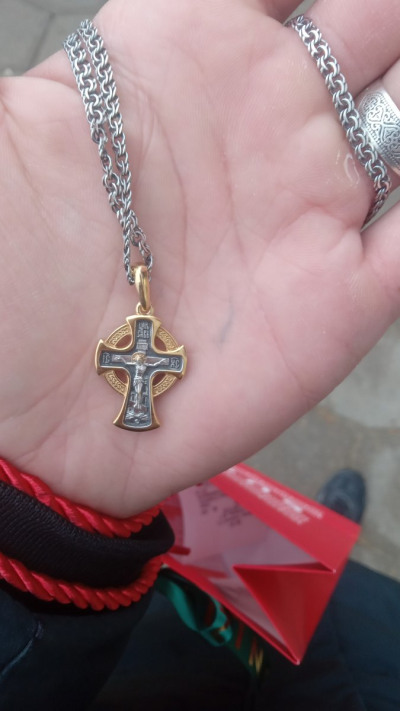 Шикарный крестик с изображениями Иисуса Христа и Архангела Михаила, сам крест совмещен с символом солнца в позолоте как и некоторые другие детали, так же сочетается затемнённое серебро со светлым, очень красивое изделие.