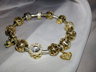 Очень освежает браслет из золотых шармов. Не так много шармов с камнями. В основном чисто из золота. А этот придаст легкости , сияния и прозрачности вашему браслету