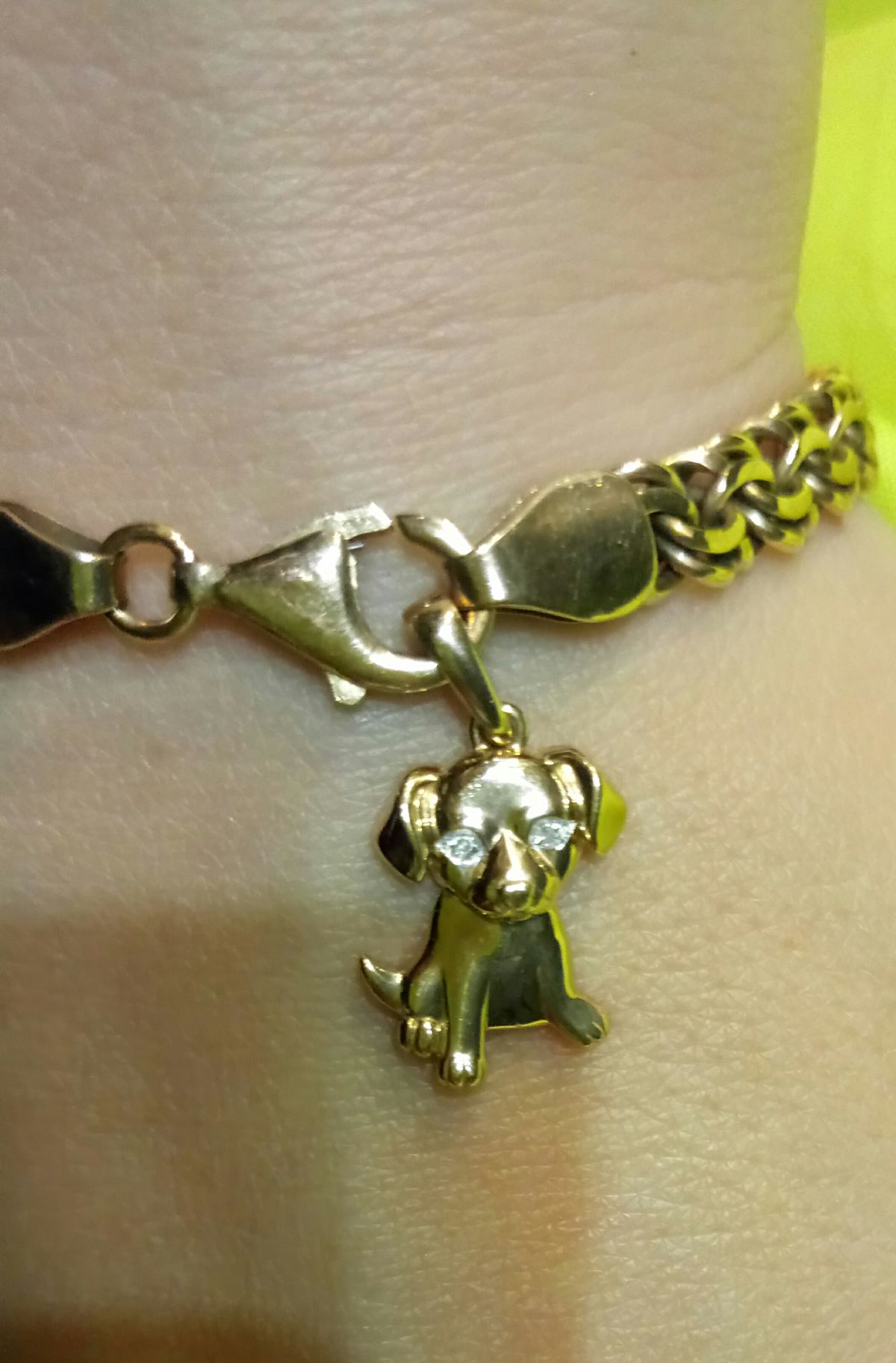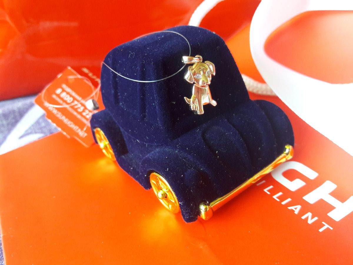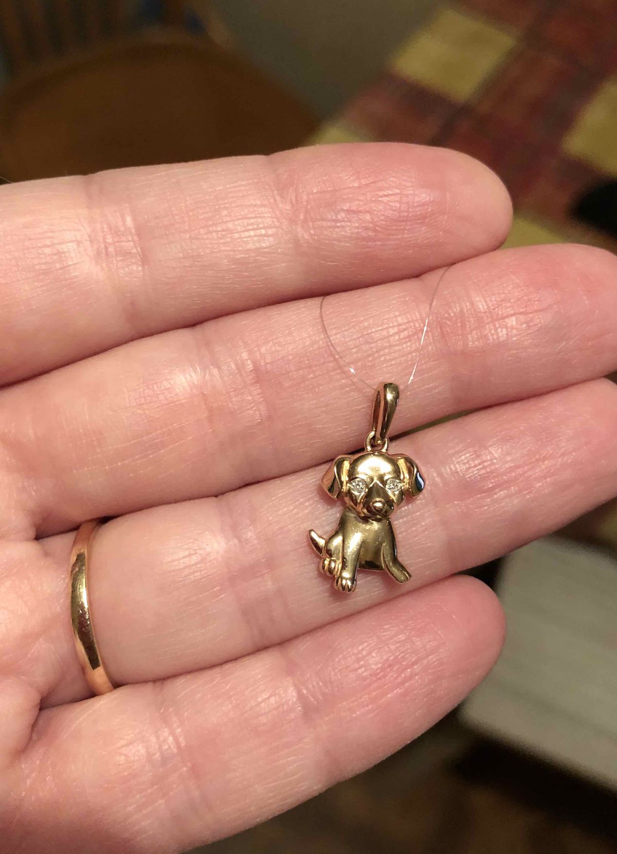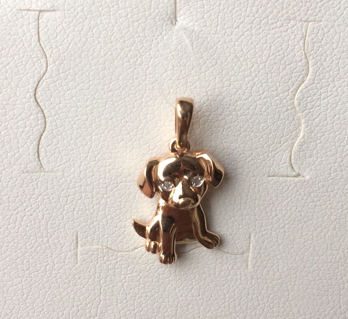 Очень хорошенькая золотая подвеска в виде собачки, глазки которой выполнены бриллиантами. Все камушки хорошо закреплены, нереально красиво блестят. 😉