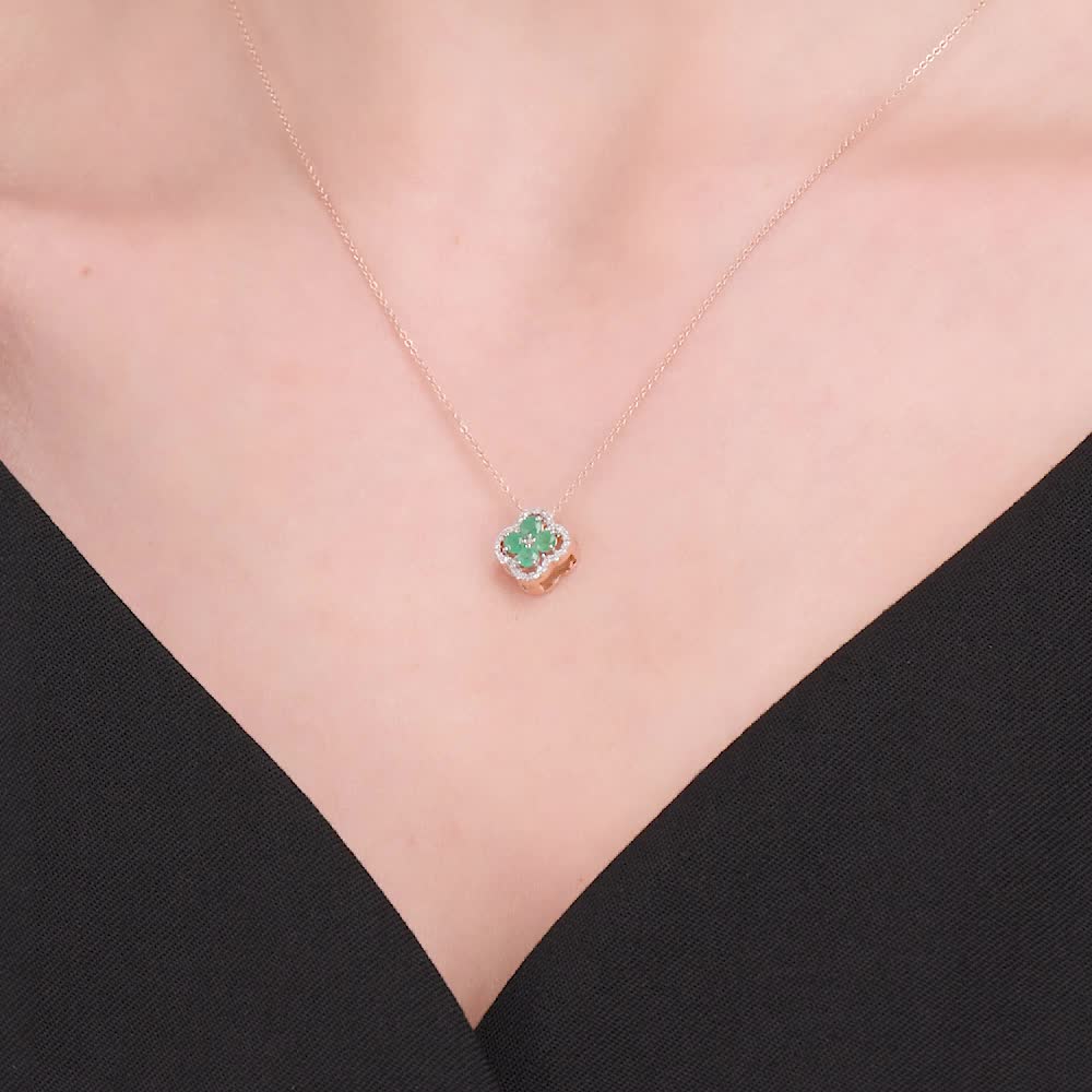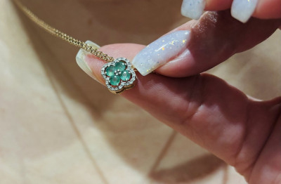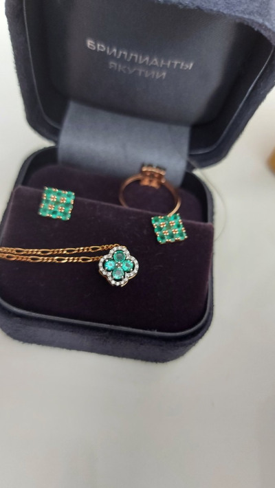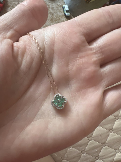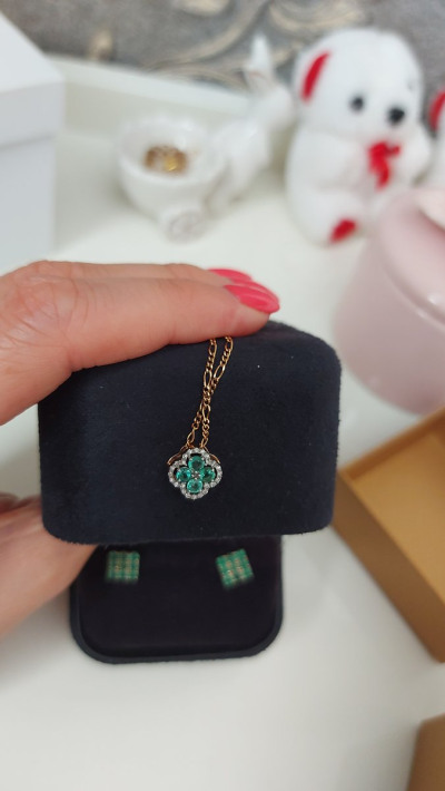 Подвеска очень красивая в виде клевера. Изумруды прозрачные, бриллианты сверкают, покупала к изумрудному набору.