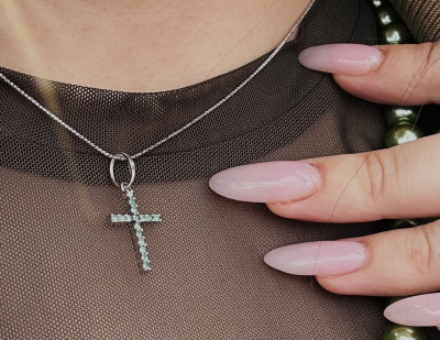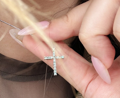 Крест покупала вместе с сережками. Цвет подошел. На крестике, камни не одной тональности. На гвоздиках, на одном камне скол